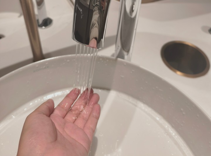 记者去了2楼厕所,厕所里的硬件确实够顶,洗手台的三合一水龙头是戴森的,查了下电商平台,单个售价就超过1.5万元。水龙头、洗手液、干手器全是感应式,全程不用碰任何按钮,洁癖星人狂喜。