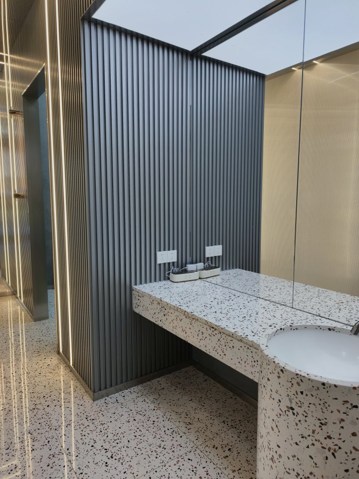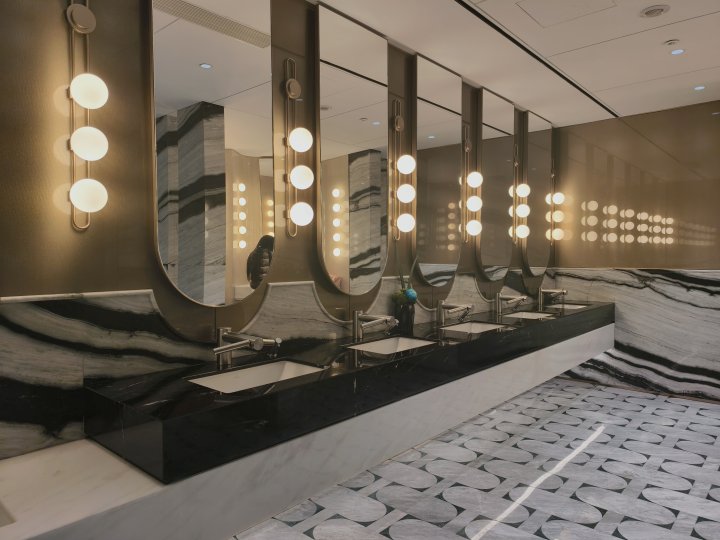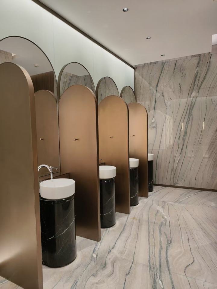4楼厕所风格更独特:铜色金属马赛克瓷砖、水墨纹理大理石、实木饰面搭配在一起,门口的飞鸟造型挂饰和大型碗状雕塑超吸睛。洗手区做了隔板设计,私密性比3楼更胜一筹,这里还藏着两个独立VIP洗手间,空间更大。
