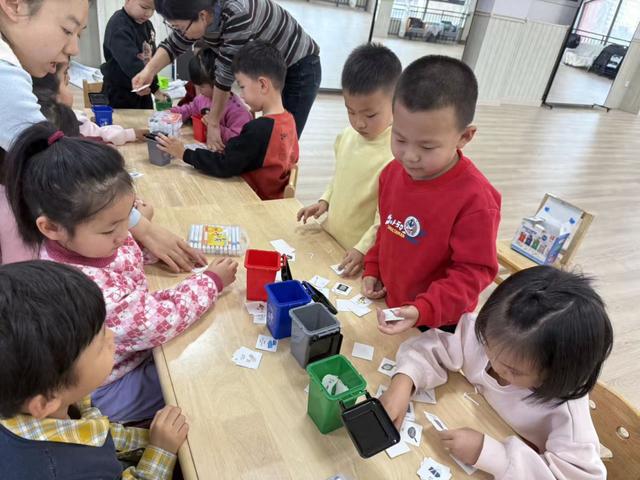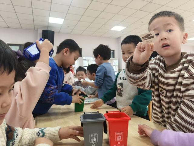 活动另一侧,垃圾分类卡片游戏区同样热闹非凡。“老师,这张卡片上画的是鱼骨头,应该放在哪个桶里?”四岁的李欣桐拿着卡片,歪着小脑袋思考。“鱼骨头是厨余垃圾,我们要把它放进绿色的桶里。”工作人员王田田耐心回答道。孩子们抽取印有不同种类垃圾的卡片,仔细辨认后投入对应的微型垃圾桶模型中。“香蕉皮是厨余垃圾,要放进绿色桶!”“旧报纸是可回收物,蓝色桶正确!”在游戏过程中,孩子们巩固了刚刚学到的分类知识,在欢声笑语中传递着环保理念。