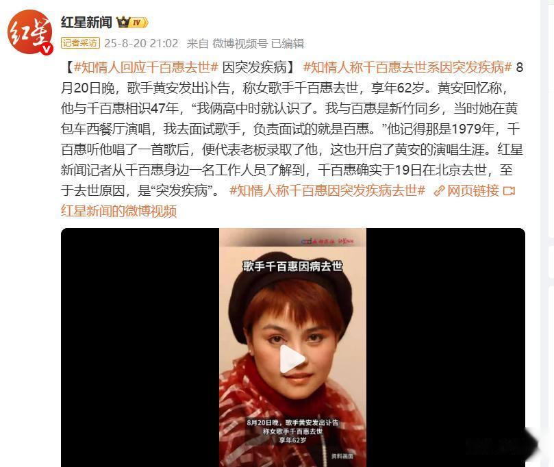 8月20日晚,知名歌手黄安代发讣告,悼念相识47年的好友千百惠。