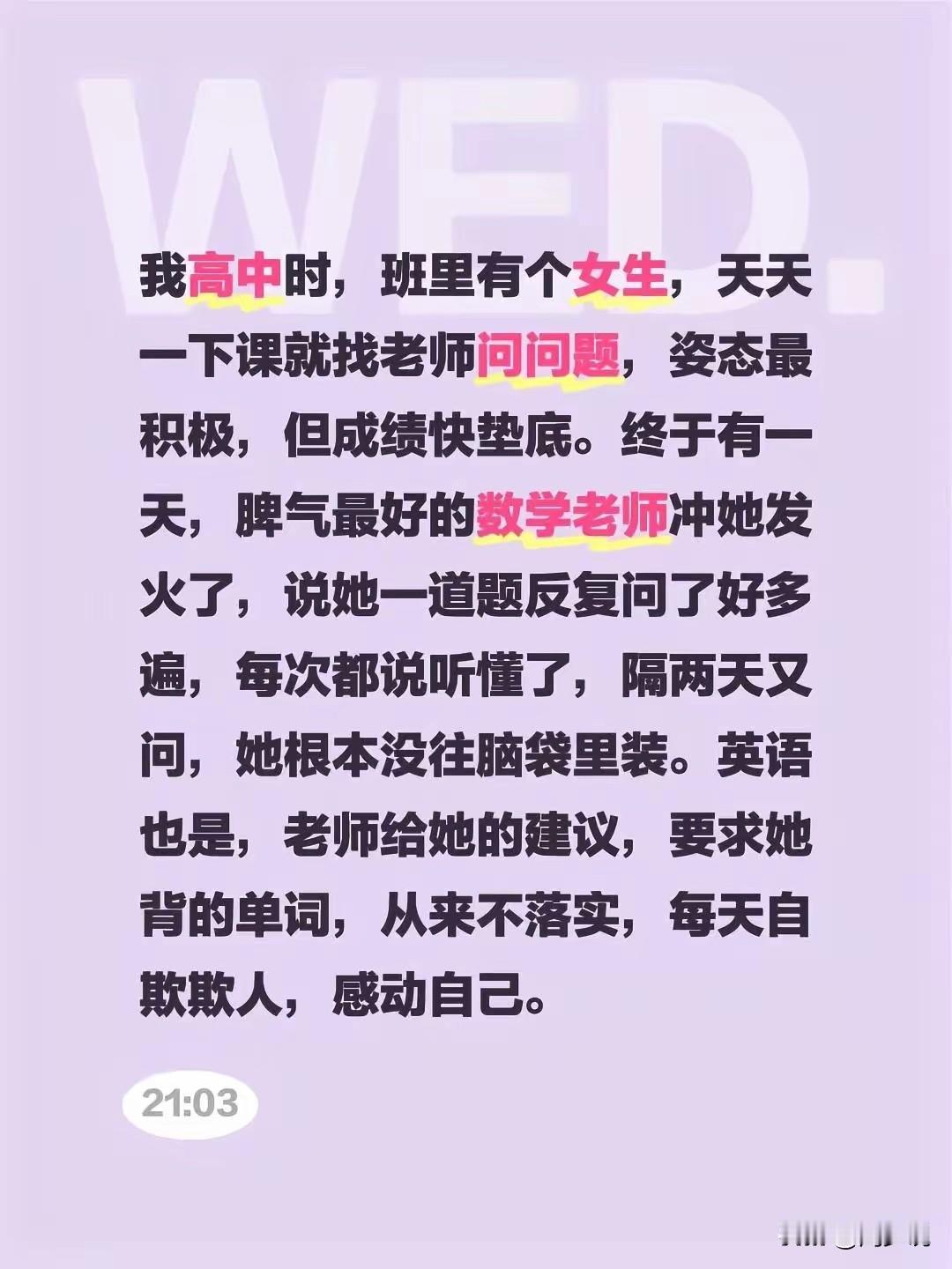 一个悲伤的故事!高中时,班里有个女生,每天都追着老师问问题,看起来比谁都积极,成绩却一直垫底。直到一次,好脾气的数学老师终于忍不住了,对她说:“这道题你问了不下五遍,每次都点头说懂了,转头又来问。英语老师也直言让她背的单词,她却一次都没落实。 此事引发网友热议,不少网友感慨:“这是典型的表演式努力,她骗过了自己,却骗不过成绩。!” 还有网友甚至表示:“身边总有这样的人,看起来很忙,其实在偷懒。” 周少想说真正的努力,是有效积累,而非重复表演。学习如耕种,不是比谁在田里站得久,而是看种子是否发芽、生长。 她看似不放过任何问题,却从未真正消化,把“提问”当成“努力”的幌子。这种状态比懒惰更隐蔽,也更危险,它让人误以为自己很拼,最后却只能收获无力与自我怀疑。 真正的进步,是从“装作听懂”到“真的搞懂”,从“看似忙碌”到“扎实前进”。成长,不需要观众,只需要结果。#寻美三湘# #长沙新朋友#