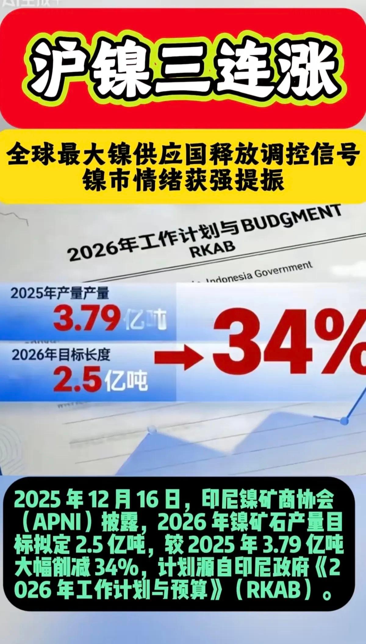 沪镍实现三连涨价!全球最大产镍国,印尼宣布镍减产,镍矿资源涨价潮持续!关注国内相