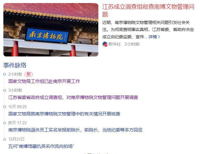 江苏省委、省政府成立调查组,对南京博物院文物管理问题开展全面调查。国家文物局工作组也已赴南京开展调查工作。必须全面彻查,这个事情不清,将影响社会公信力。 1959年,庞家向南京博物馆捐赠“虚斋旧藏古画”137件(套)。1997年,被专家认定为赝品的《江南春》图卷拨交给原江苏省文物总店。2001年被“顾客”以6800元价格购买。2025年5月,仇英《江南春》图卷出现在北京一拍卖预展上,估价达8800万元。2025年6月,庞叔令前往南京博物院核验137件(套)藏品原件,仇英《江南春》图卷、赵光辅《双马图轴》、王绂《松风萧寺图轴》、王时敏《仿北苑山水轴》、汤贻汾《设色山水轴》,五件捐赠的文物,已无法查到。 这件事透着蹊跷,透着邪门。按道理来说,鉴定为赝品的话,那应该还给捐赠人或者让国家文物主管部门确认鉴定,而南京博物馆至今没有提供鉴定的相关证明材料。 如果有猫腻,也不一定是现在工作人员的过错,可能倒查几十年才知晓真实情况。不管如何,一定要查个水落石出,清清楚楚!