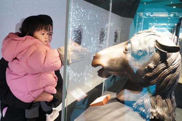 作为展览的视觉焦点,是现场长达16米的“巨马”大型艺术装置。“巨马”足有3层楼高,吸引人们纷纷驻足打卡。其设计灵感直接源自圆明园馆藏文物——马首铜像,并融汇清代宫廷绘画《乾隆大阅图》的英武气韵。该装置不仅是对2026农历马年的艺术献礼,更深层地传递了圆明园所承载的奋发进取、生生不息的文化精神,承载着“新年你我皆是黑马”的美好期许。