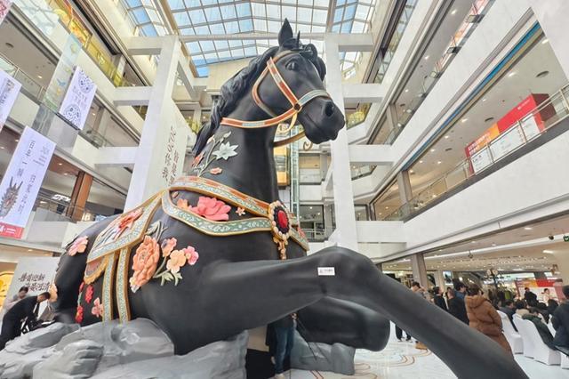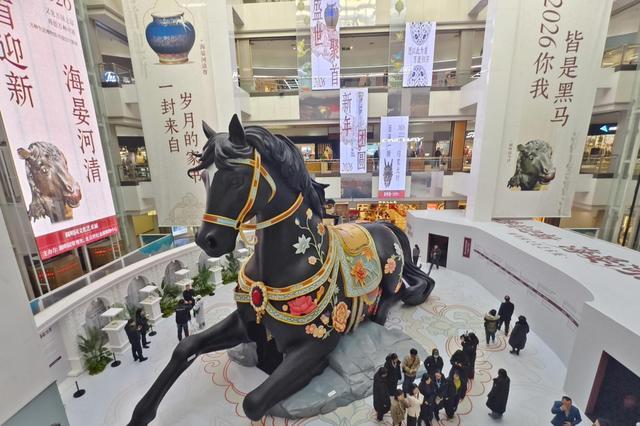 12月23日,一匹黑色的“巨马”亮相北京世纪金源购物中心2层中庭,为人们带来新年的祝福。“巨马”的设计灵感直接源自圆明园馆藏文物——马首铜像。“兽首迎新海晏河清——圆明园文化艺术展”在这里开幕。