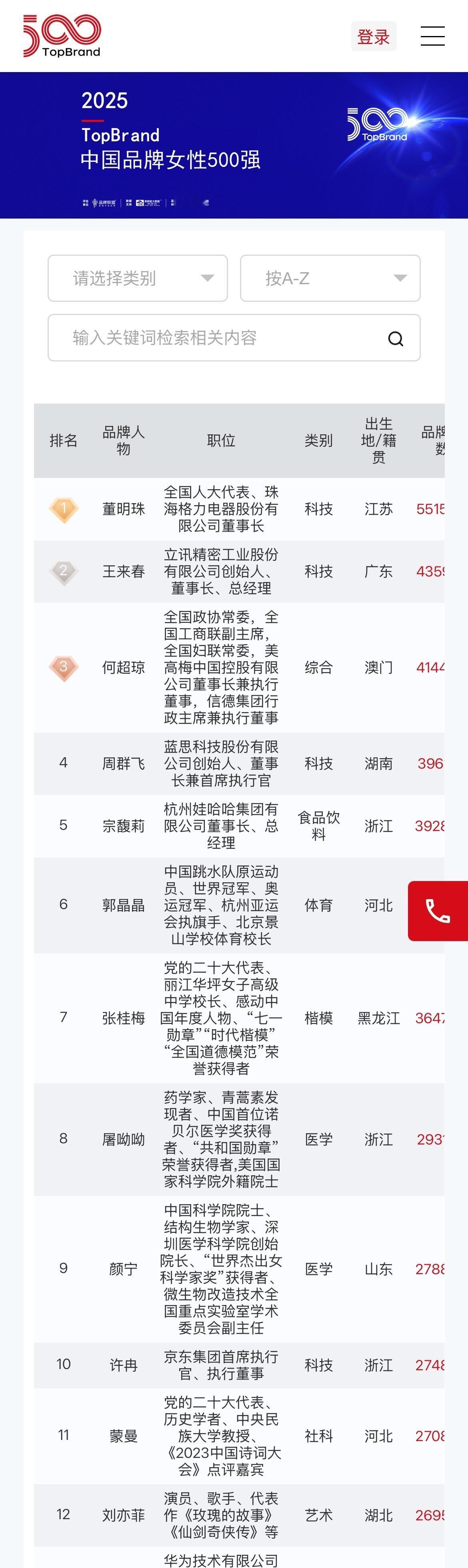 刘亦菲2025中国品牌女性500强刘亦菲2025中国品牌女性500强总榜第12位