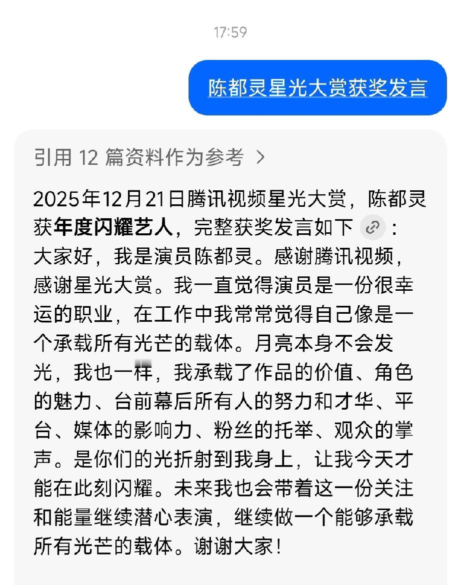 多读书真的有用, 看陈都灵的获奖感言,才知道什么叫有内涵。 她说:月亮本身不会发光,我也一样,是你们的光折射到我身上,让我今天才能在此刻闪耀。 终于明白老一辈为什么喜欢知书达理的女孩子了,陈都灵的获奖感言一说,路人也粉上她了。 她身上也确实有文化人的底蕴,名牌大学毕业,进入演艺圈后用几年的时间打磨演技,不急不躁,一步一个脚印地走出来。 为人也像她所说的一样,不骄傲,把自己看得特别明白,认为获奖并不是自己一个人的荣耀。 这才是我心中的女明星,气质好,情商高,脑子里有东西,谈吐好,长得漂亮,读书多,学历高。 简直完美!