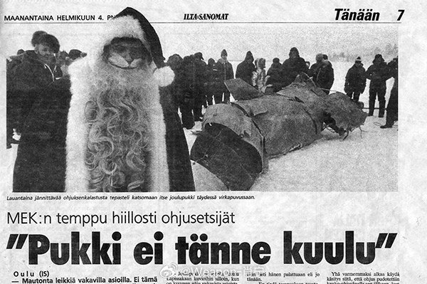 烽火问鼎计划照片中的历史 1984年12月28日,苏联海军K-235号潜艇(675型)向训练目标发射了一枚RM-6导弹。导弹偏离目标,飞越挪威领空,最终安全降落在芬兰伊纳里湖。一些精明的芬兰人以苏联导弹为背景,在圣诞蛋糕(Joulupukki)上做广告。当地一家酒店的菜单上出现了以这枚坠落导弹为主题的菜肴,其中一道名为“火箭红点鲑”(Rakettirautu)。这道菜其实就是用锡纸包裹的普通北极红点鲑烤制而成,但上面插着一根烟花。导弹残骸后来被归还给了苏联。芬兰获得了50万芬兰马克的赔偿。