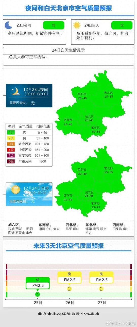24日白天,高压系统控制,偏北风,扩散条件有利。预计空气质量指数20-40,1级,优。预计25日:1级;26日:2级;27日:2级。具体分区预报结果见附表。