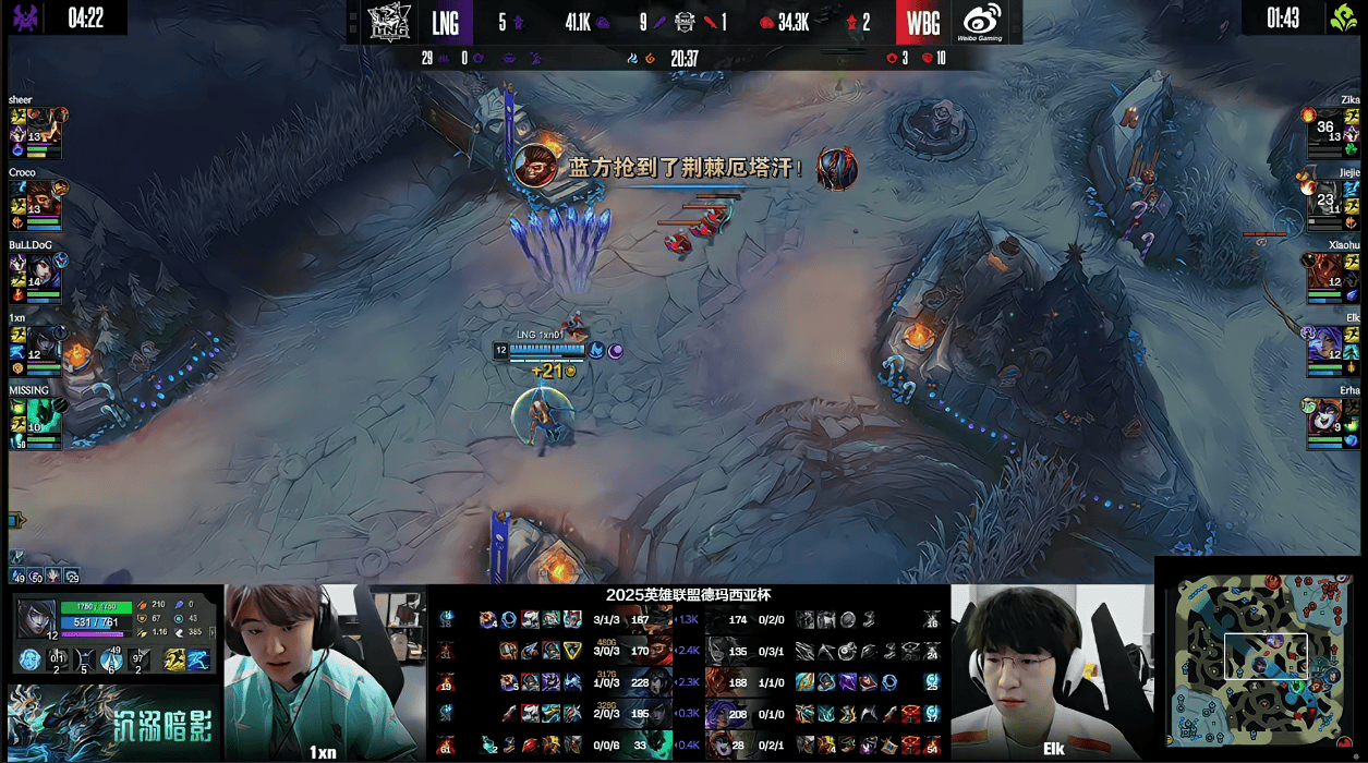 20分钟,sheer兰博一打三直接秒杀Jiejie,随后LNG众人赶来拿下厄塔汗