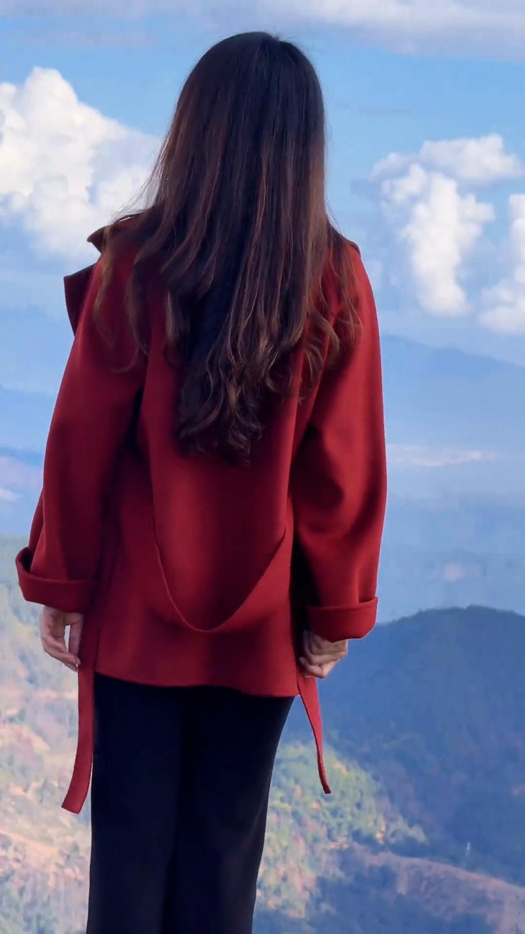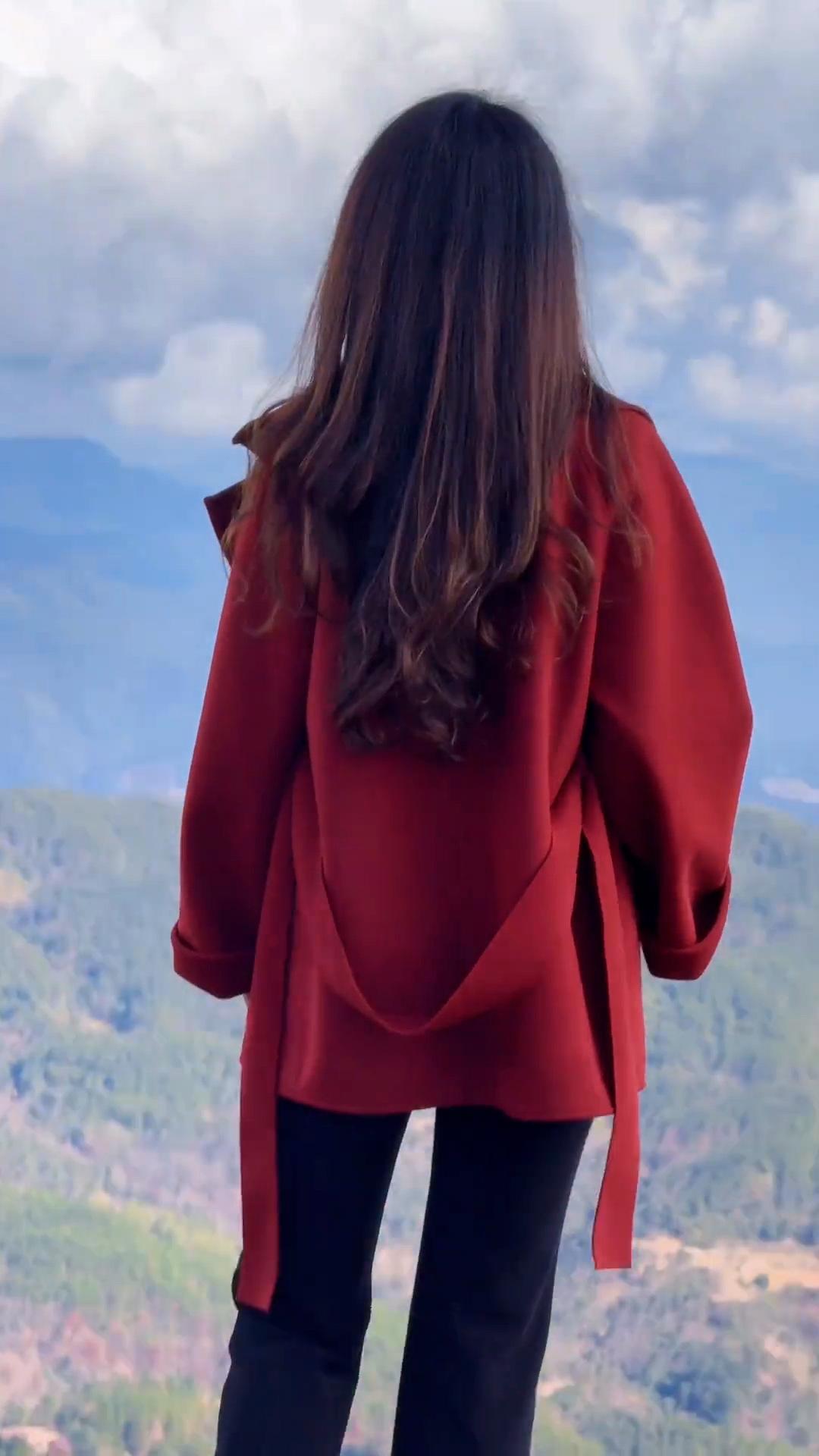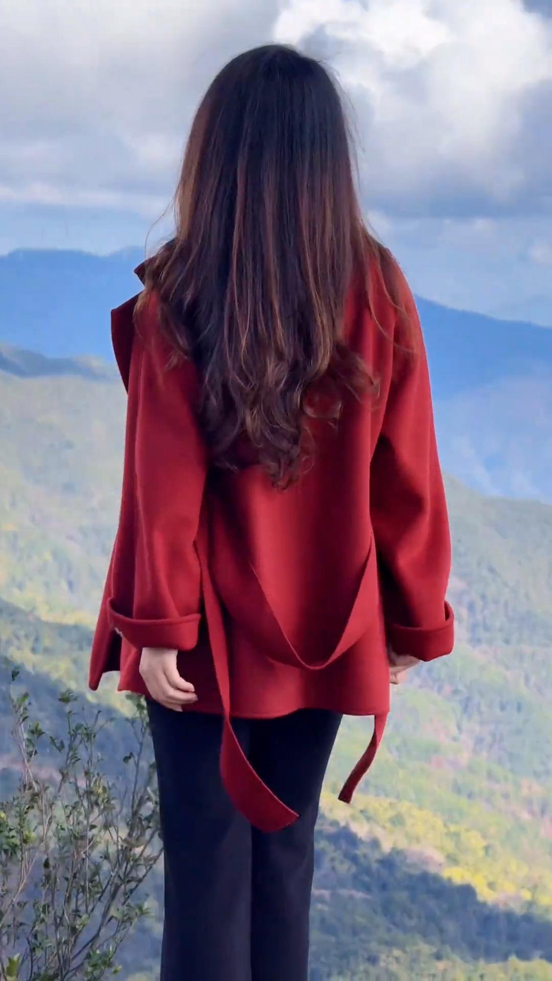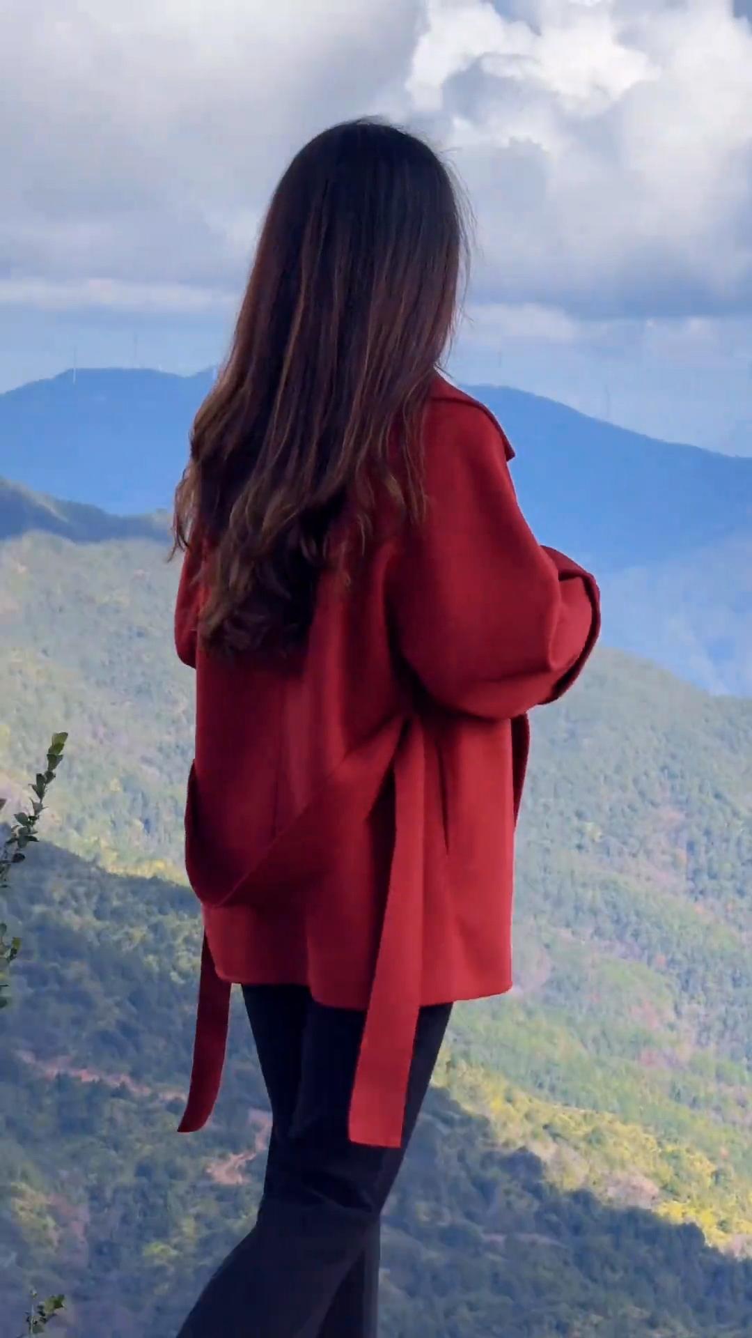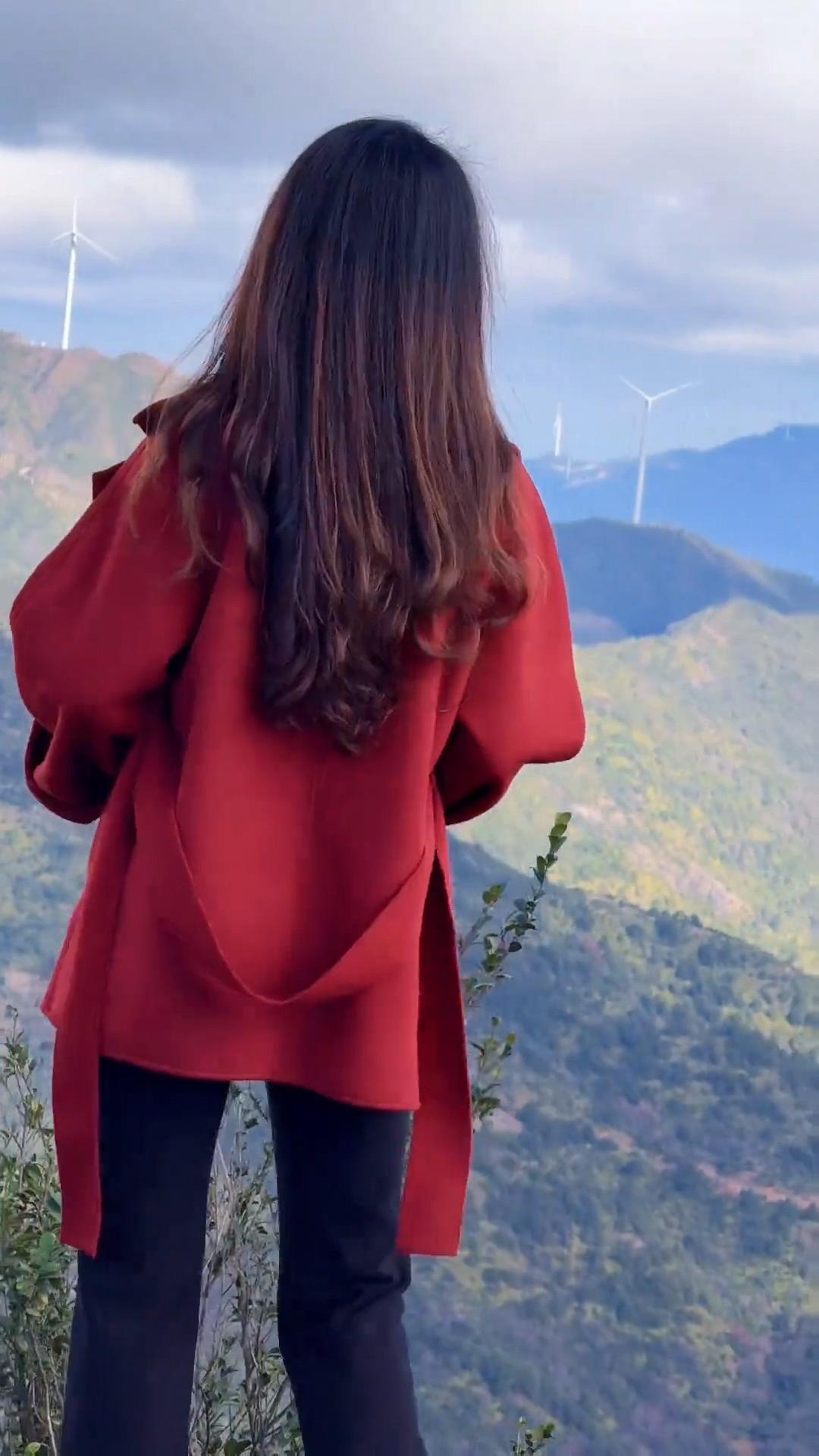 红衣少女背对镜头,眺望山峦起伏,心旷神怡。