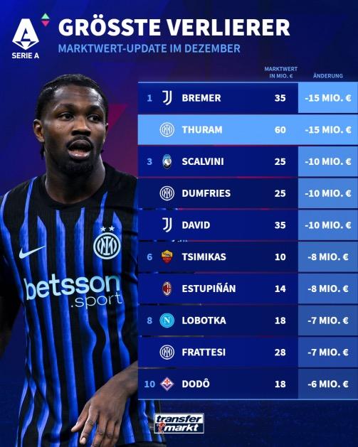 12月意甲球员身价跌幅榜:布雷默和图拉姆跌1500万并列第一