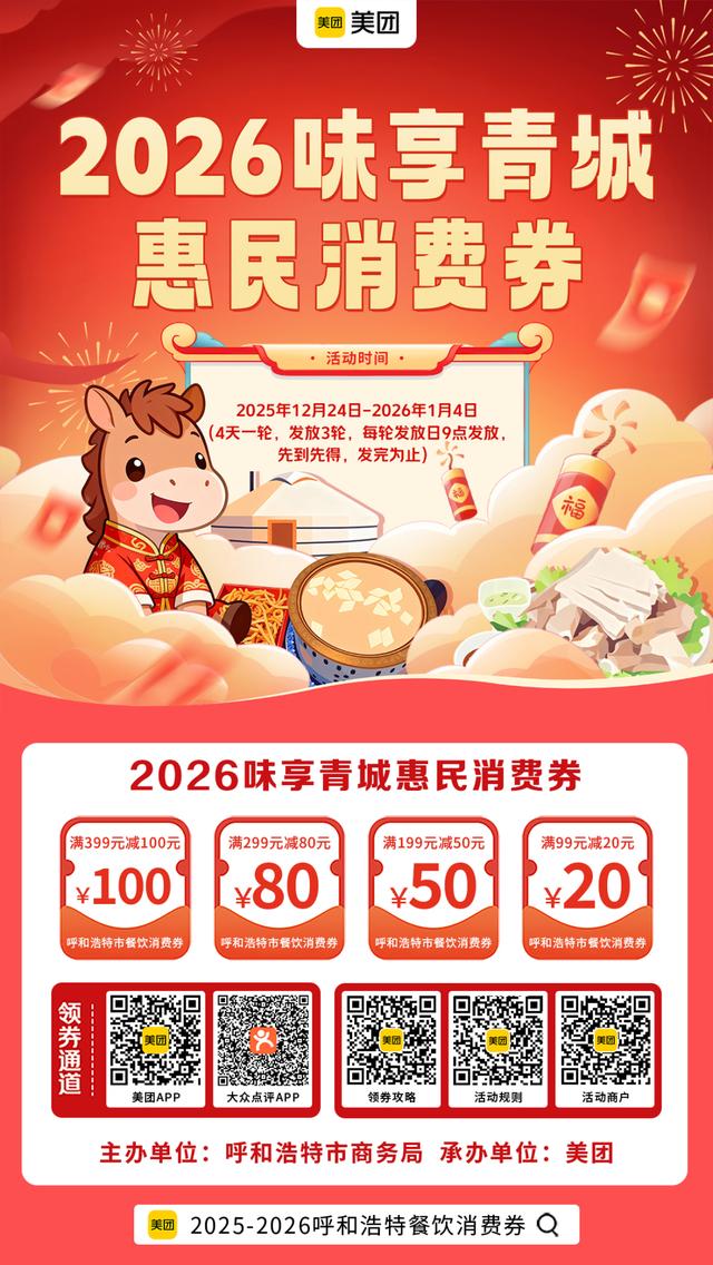 呼和浩特市内消费者可通过美团App扫描申领通道二维码或登录美团App搜索“2025-2026年呼和浩特餐饮消费券”进入活动专区领券,在参加活动的实体店就餐,并使用美团App付款时直接抵用。成功领取的消费券可在“美团App-我的-红包卡券-我的券”页面查看。