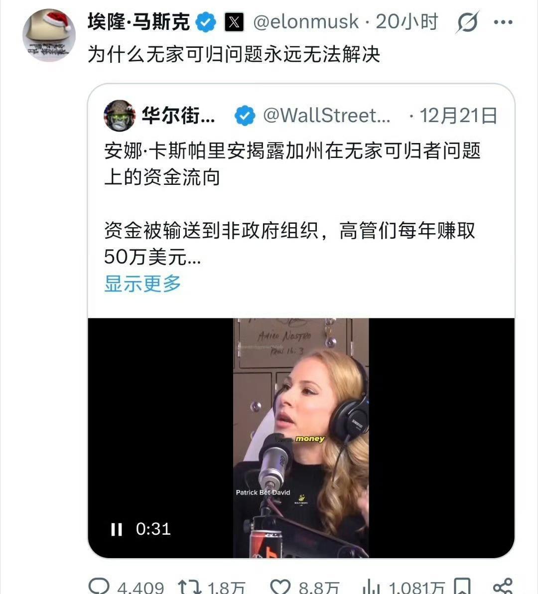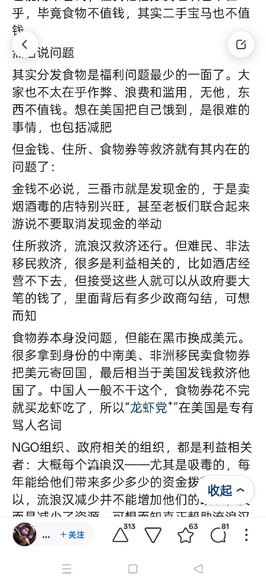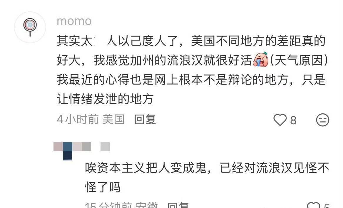“我感觉加州的流浪汉好活”“有的流浪汉在楼下看书,比我还好学”“以己度人,网上是情绪发泄的地方”,由人变成鬼,好一个恶魔,亚空间污染已深入骨髓了。 假美国人总是替美国美化,真美国人嘲笑、气愤假美国人。 美国很像社会达尔文,lose一次就很难翻身,社会制度就是这么设计的。一次失误,一次车祸,就能让你连续爆雷,让你进入斩杀线,成为流浪汉。 马斯克:为什么无家可归者永远无法解决? 我觉得最恐怖的是他们宁肯流浪,宁肯冷死饿死,也不组织起来……不去找找根源问题。只是一到冬天一些农村地区就开始有打家劫舍了,家里男丁要带枪守夜。就没人针对他们的政府部门……
