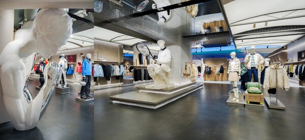 步入门店,以"意动永恒"为主题的专业运动区率先进入视野。这一区域以竞技力量元素与科技感的碰撞打造体验空间:入口的滑雪运动专区为空间注入米兰冰雪赛场的速度与激情;后场来到网球与高尔夫专区,与身披FILA经典网球单品BB1大满贯POLO的雕塑《网球新章》其一再次相遇,感受古典艺术的现代张力,并探索品牌在网球领域的传承与拓新。