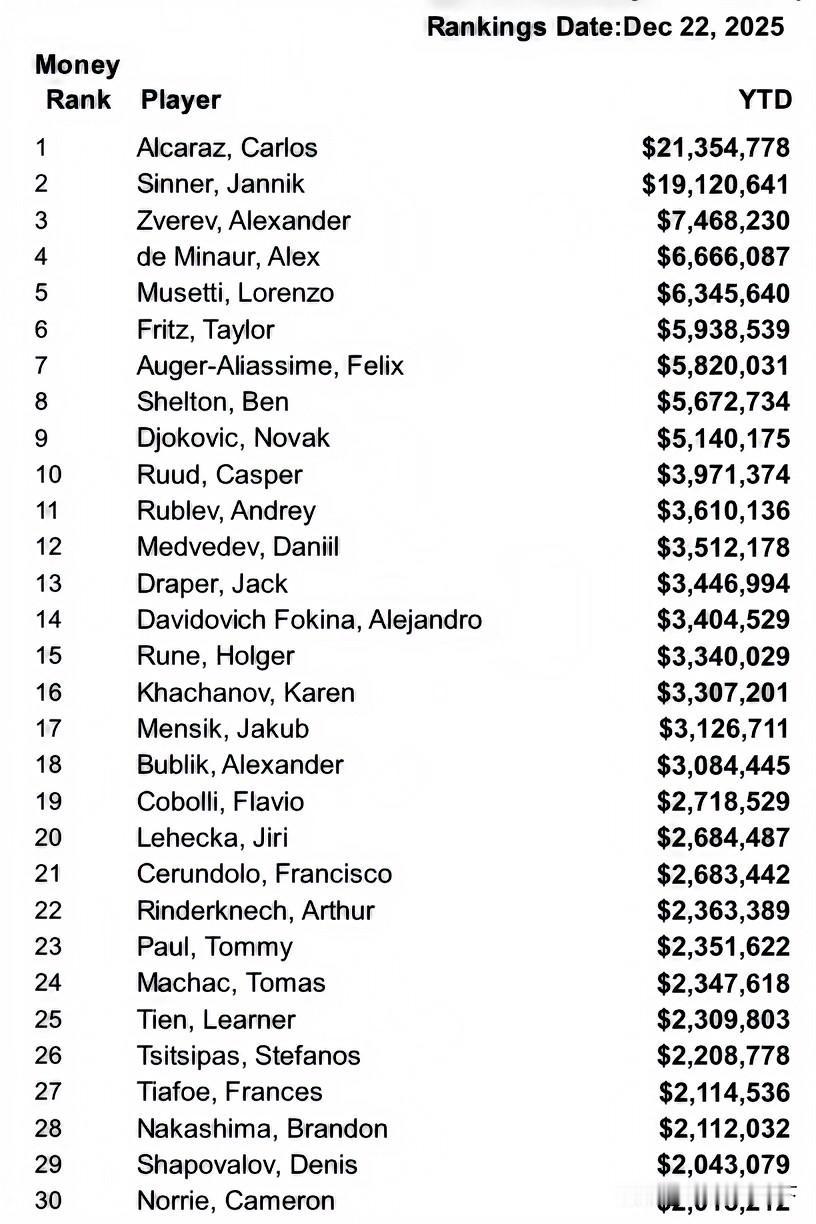 ATP官网公布2025年最终奖金名单,阿尔卡拉斯🇪🇸获得年度第一21,354