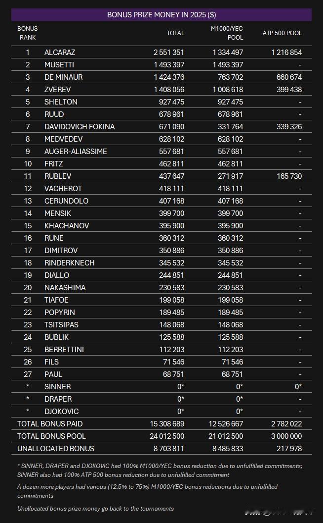ATP官网公布2025年最终奖金名单,阿尔卡拉斯🇪🇸获得年度第一21,354,778美元,该名单已添加赛季额外奖金。 由于阿尔卡拉斯的 M1000 奖金减少了 300 万美元,他最终未能打破德约科维奇在2015 年创下的2160万美元纪录。 2025年度奖金排名(前五名): 1、🇪🇸阿尔卡拉斯2135.4778万美元; 2、🇮🇹辛纳1912.0641万美元; 3、🇩🇪兹韦列夫7468.230万美元; 4、🇦🇺德米纳尔6666.087万美元; 5、🇮🇹穆斯蒂634.5640万美元。 ATP还有 870 万美元(奖金池总额为 2400 万美元)返还给了锦标赛。阿尔卡拉斯网球 网球 阿尔卡拉斯 辛纳 兹韦列夫