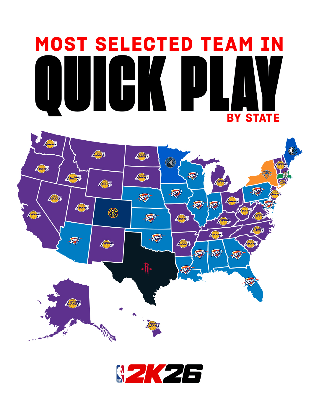 NBA2K全美各州玩家快速游戏选择最多球队:湖人、雷霆前二