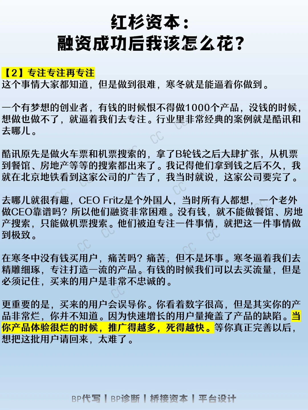 从投资人的角度来看,很多公司拿到B轮或者是C轮的钱以后,就开始出问题,甚至死掉。