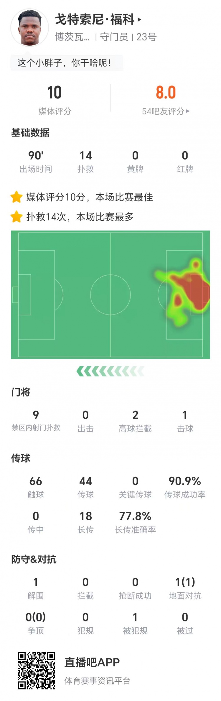 赛后技术统计数据显示,福科本场比赛做出了惊人的14次扑救,其中禁区内射门扑救多达9次。另外,他还有两次高球拦截,以及1次击球。在媒体评分中,他得到了10分满分。
