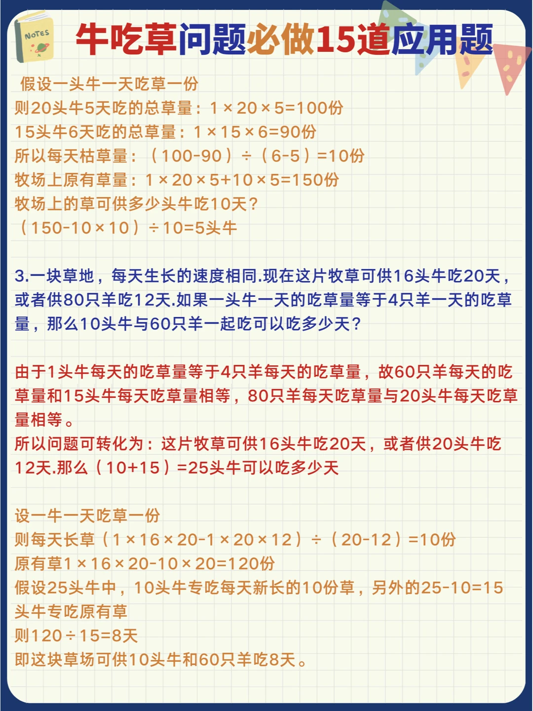✅这四个公式是解决牛吃草问题的基础。一般设每头牛每天吃草量不变,设为"1",解题关键是弄清楚已知条件,进行对比分析,从而求出每日新长草的数量,再求出草地里原有草的数量,进而解答题总所求的问题。