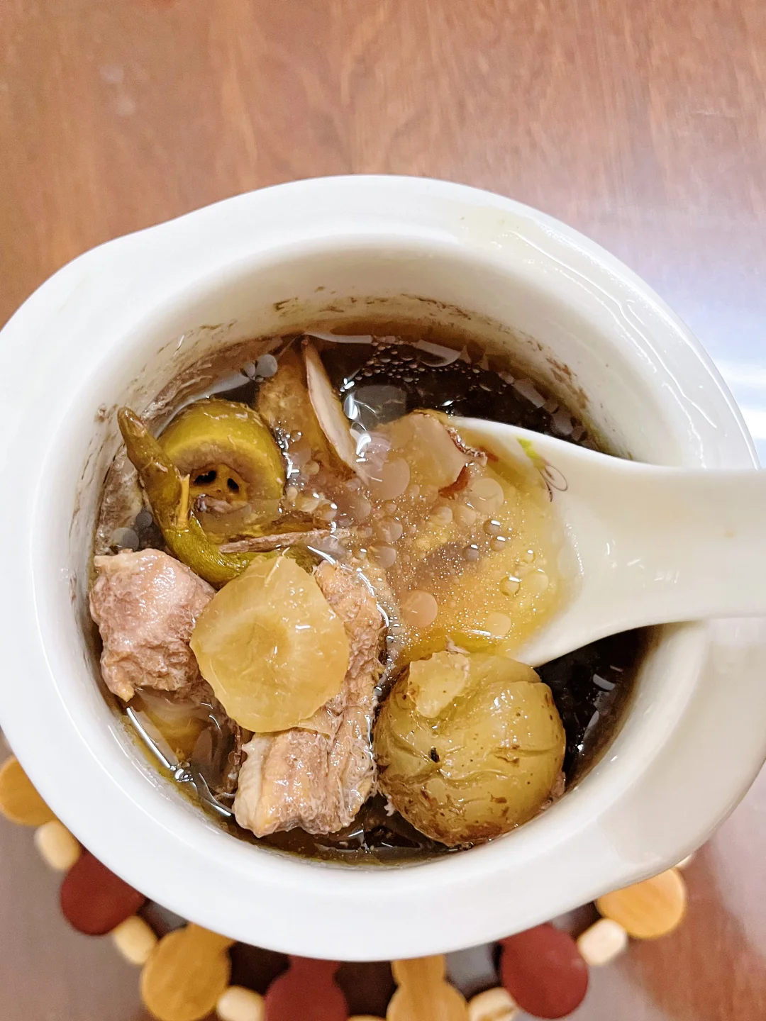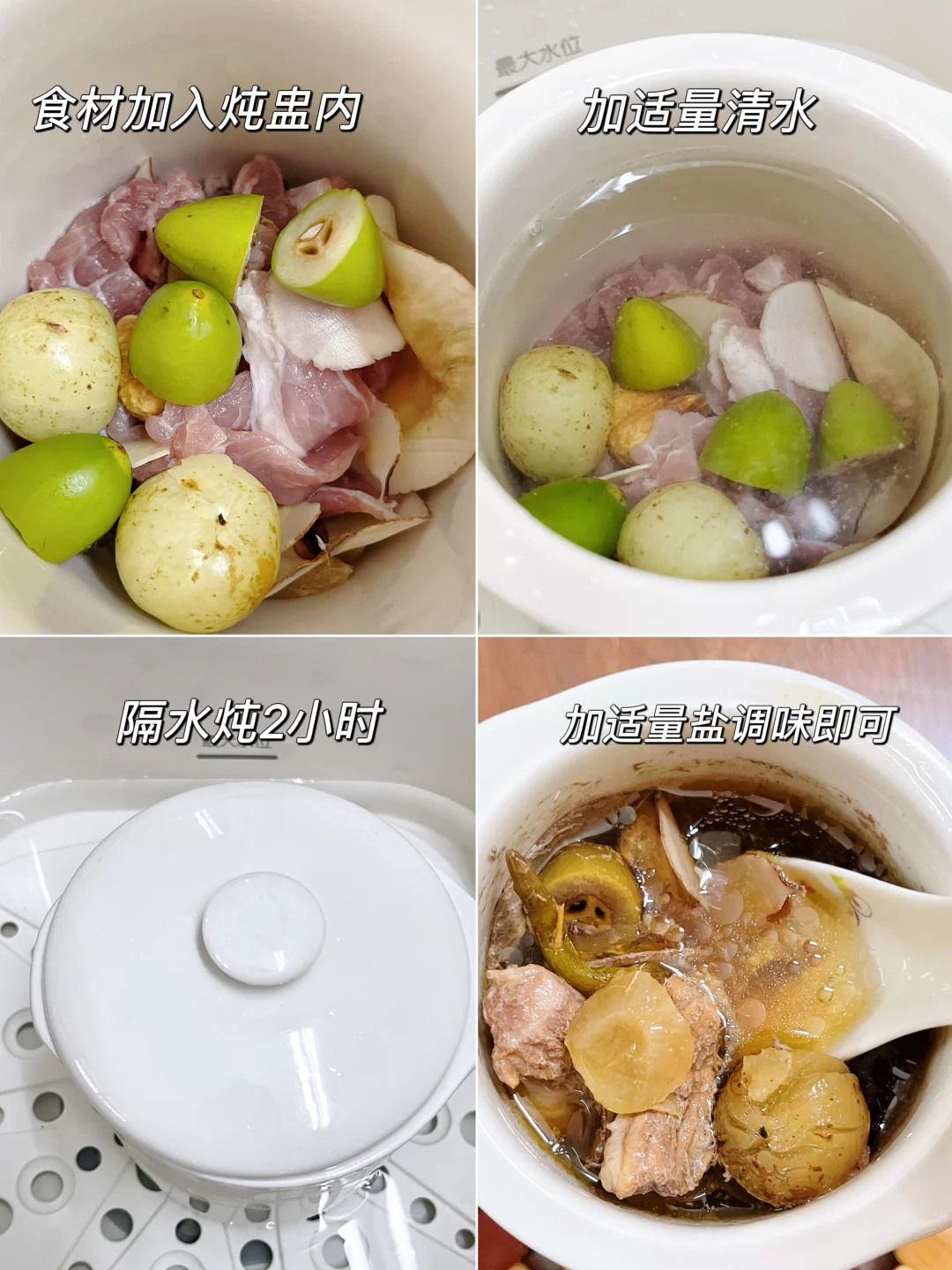 入秋后,天气干燥,经常熬夜,换季喉咙不适,可以来一碗石斛橄榄油甘瘦肉汤,清月市利口因,下🔥汤。 准备食材🫕 青橄榄、油甘、石斛、瘦肉、麦冬、海底椰、无花果 做法🥘 青橄榄、油甘拍半,其它食材洗净 所有食材加入炖盅内,加入适量清水,隔水炖2小时,炖完加适量盐调味。 这碗石斛橄榄油甘瘦肉汤就做好了,汤水清甘清甘,很好喝~
