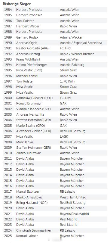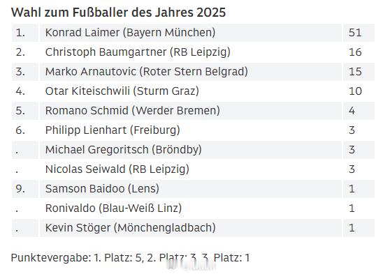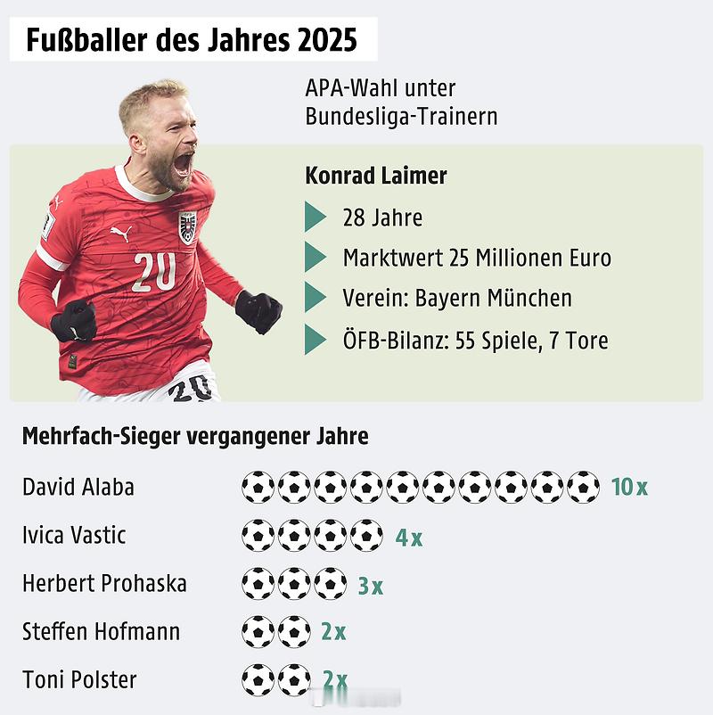 噢豁,28岁的莱默首次当选奥地利足球先生!在这项由奥新社组织12名奥甲俱乐部主教练投票的传统评选中,莱默获得了10张第一名选票(注:第一名5分、第二名3分、第三名1分),积51分,以绝对优势击败去年的获奖者鲍姆加特纳(16分),以及2018年赢家阿瑙托维奇(15分)。萨尔茨堡红牛主帅托马斯·莱奇称赞莱默道:“他已经在世界上最好的俱乐部之一站稳了脚跟,并且长时间以来一直保持着高水平。”而林茨主帅屈鲍尔则表示:“他是一位全能型球员,能在高水平的比赛中担任多个位置,随拜仁慕尼黑赢得了德甲冠军,并且在奥地利国家队中一直所有表现。”蓝白林茨临时主帅加莱特纳的发言应该是最高度概括的,他说:“尽管他已经不是那么年轻,但近年来技术和足球水平都取得了显著进步。”奥地利足球先生的评选始于1984年,拜仁旧将阿拉巴以10次获奖霸榜,长期效力于维也纳快速的拜仁青训球员施特芬·霍夫曼也曾2次获奖,而另一名拜仁名宿齐克勒则在2006年当选。德甲拜仁慕尼黑