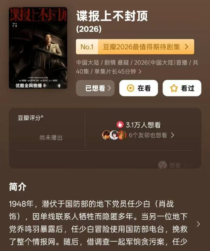 谍报上不封顶豆瓣年榜2026最值得期待剧集第一肖战谍报上不封顶最值得期待剧集 谍报上不封顶豆瓣年榜2026最值得期待剧集第一 ,肖战谍报上不封顶最值得期待剧集,谁懂这个任少白对我们的吸引力呢,燥侯住和你的正事见面啦~