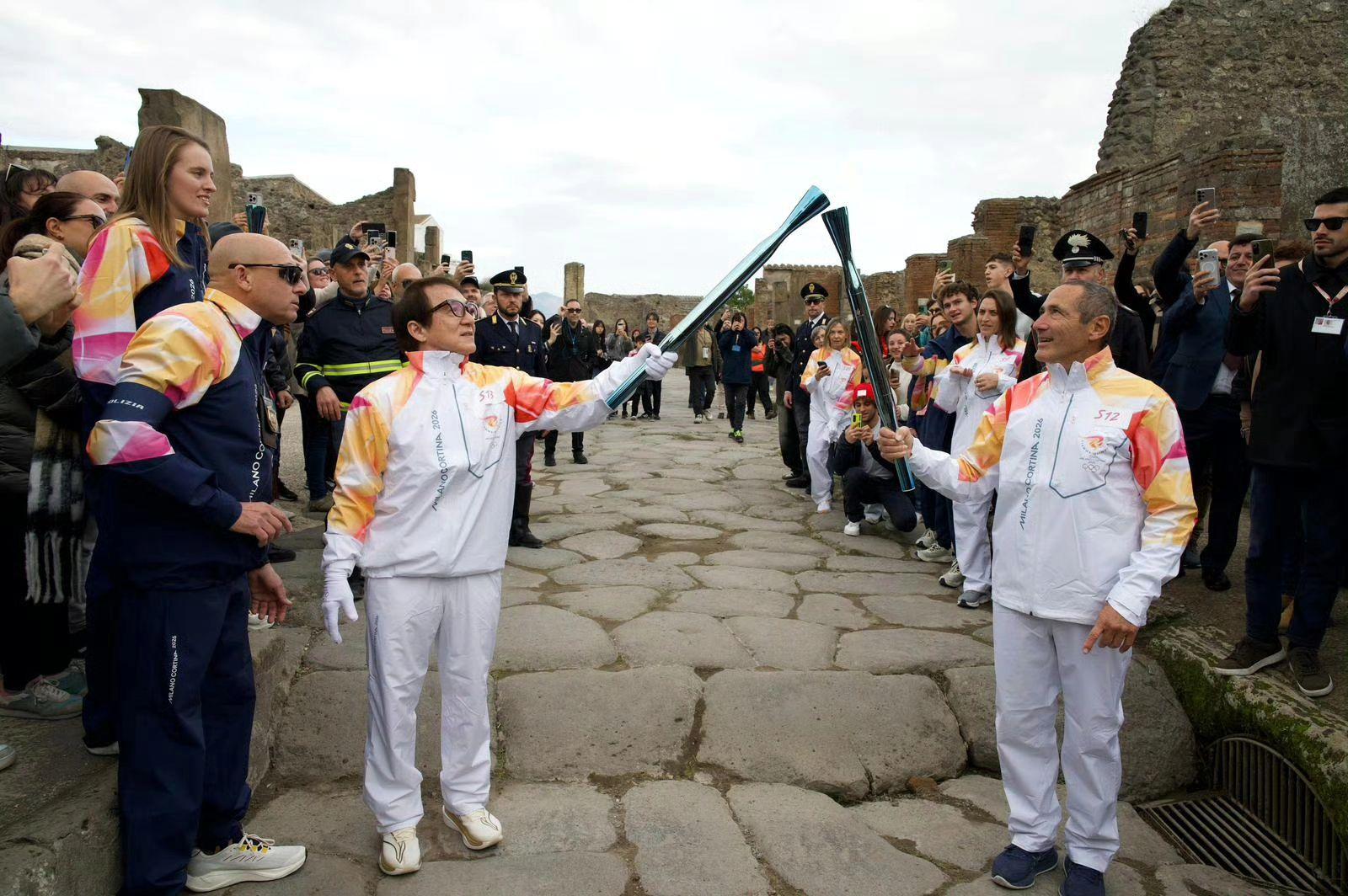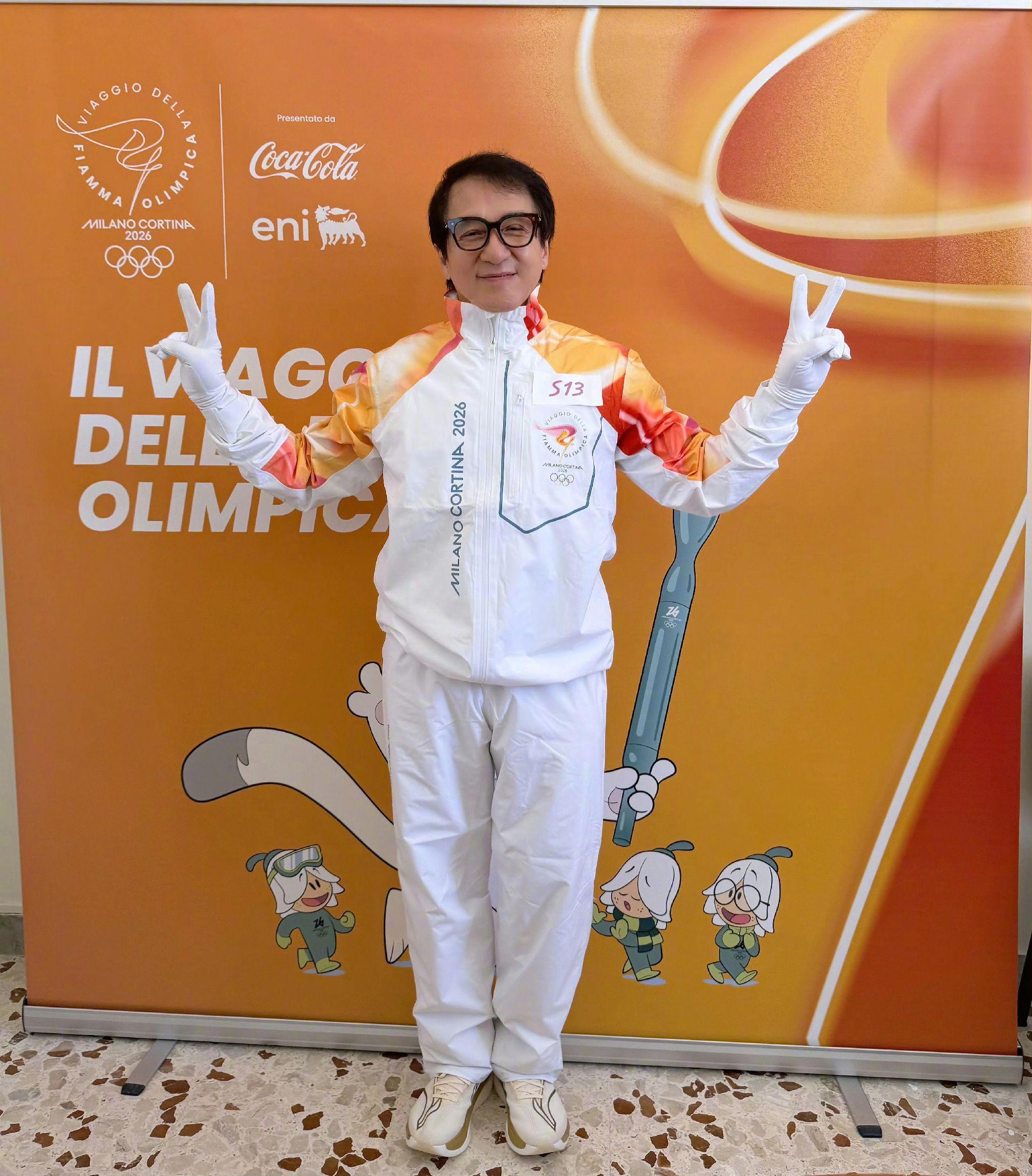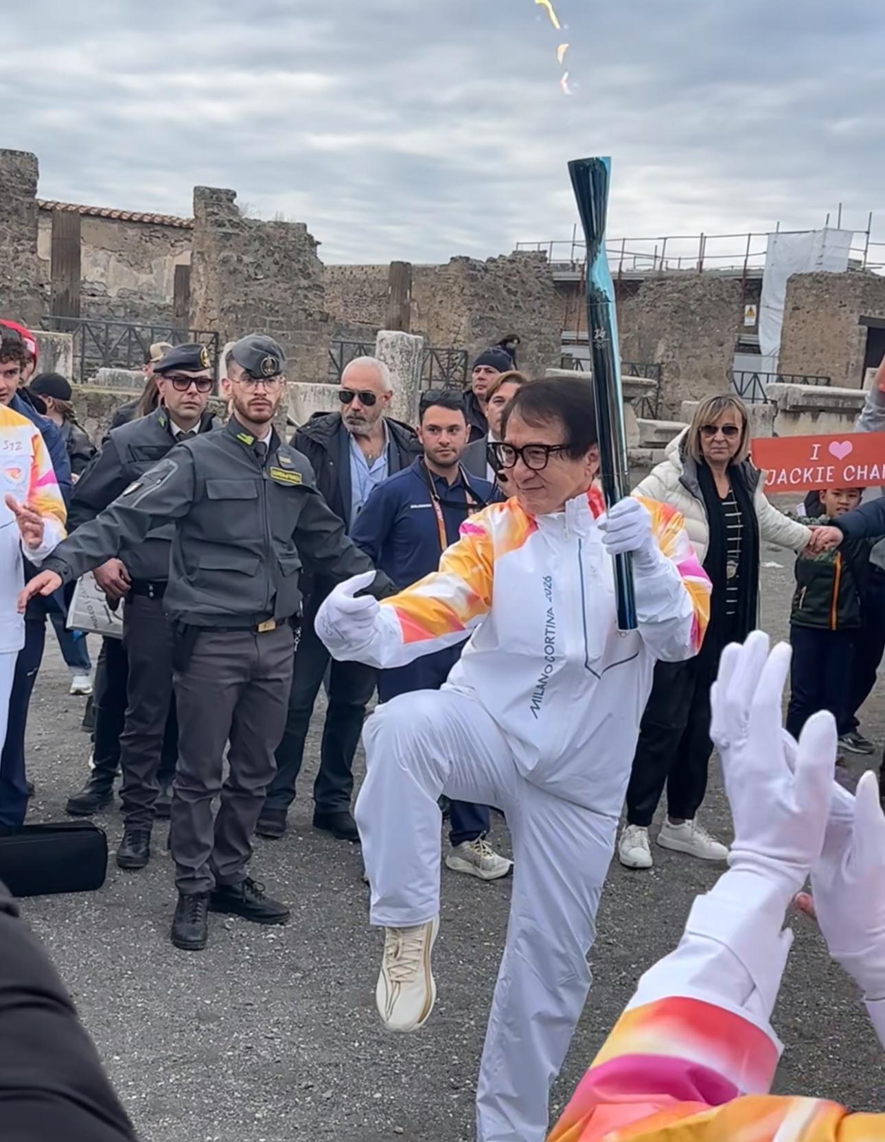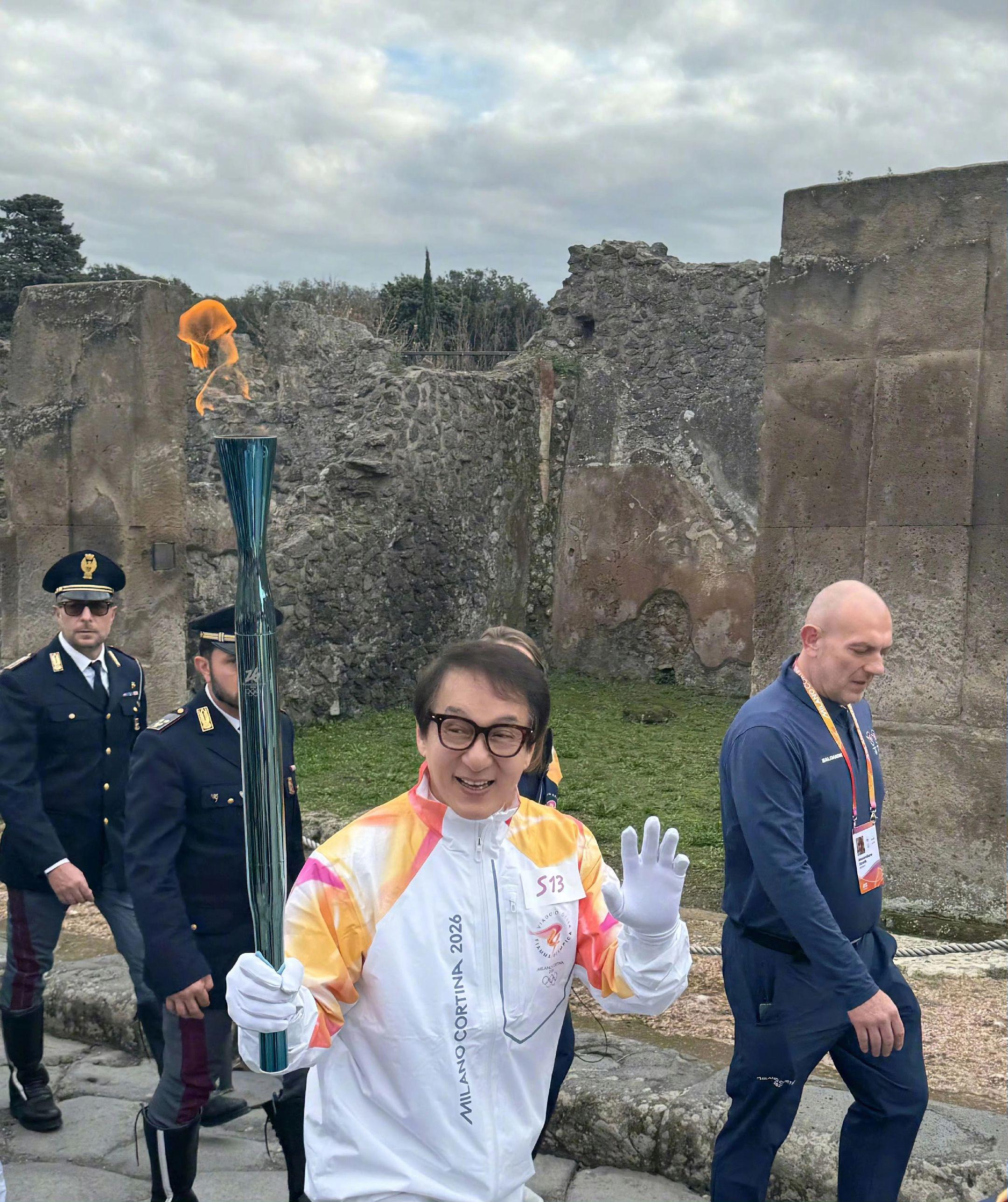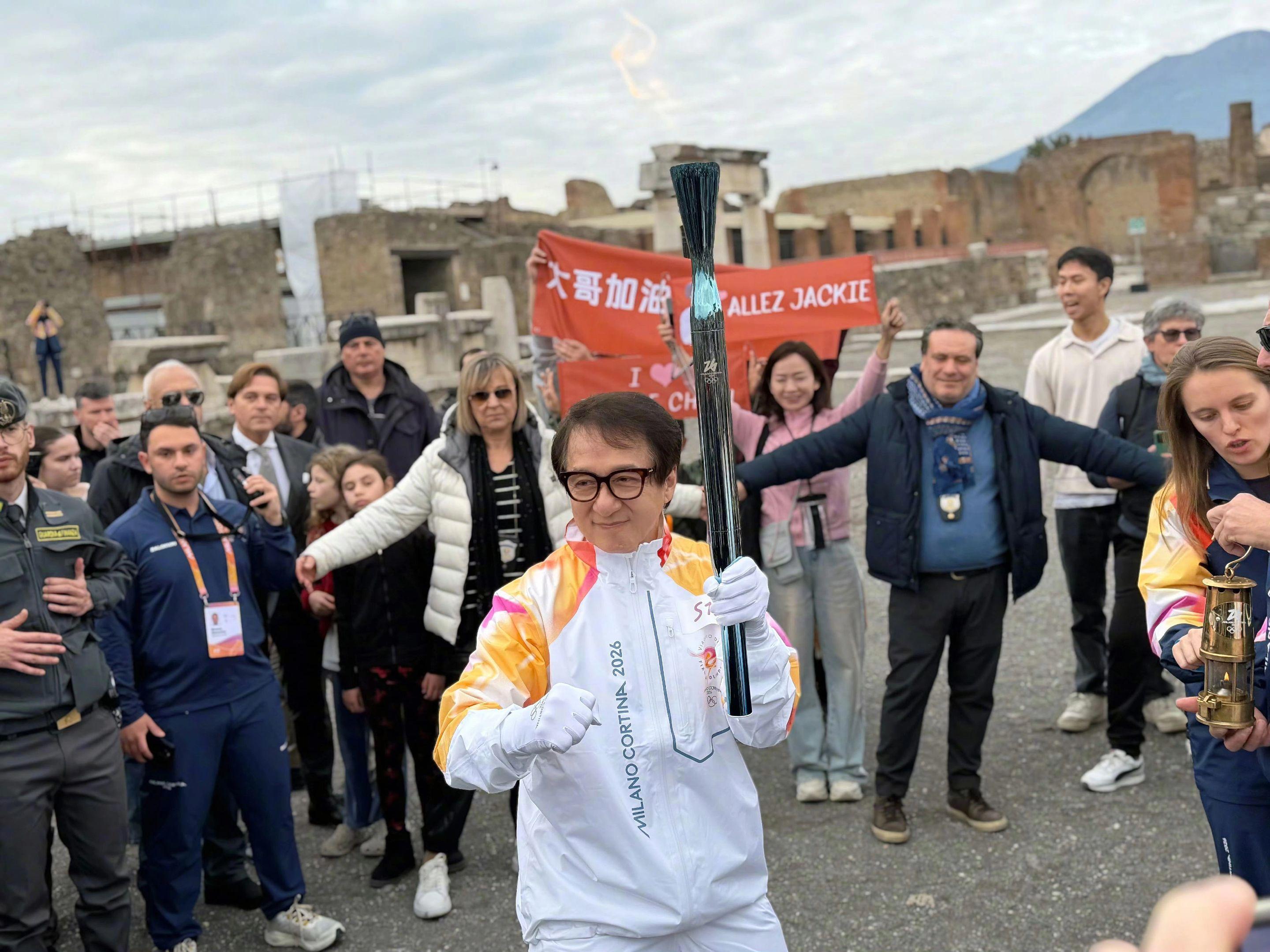 中国电影报道: 2026 年米兰-科尔蒂纳冬奥会火炬传递12月22日抵达意大利古城庞贝,动作电影巨星成龙作为火炬手参与了这一历史遗址中的传递活动。成龙大哥手拿熊猫玩偶与火炬合影,时刻不忘弘扬中国文化。❤️