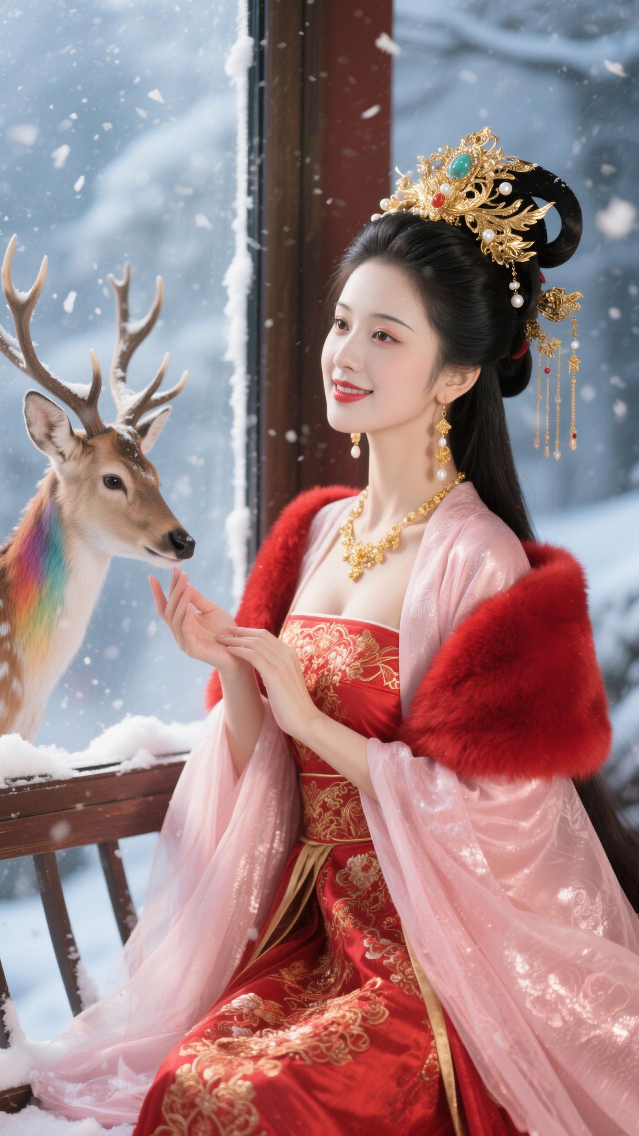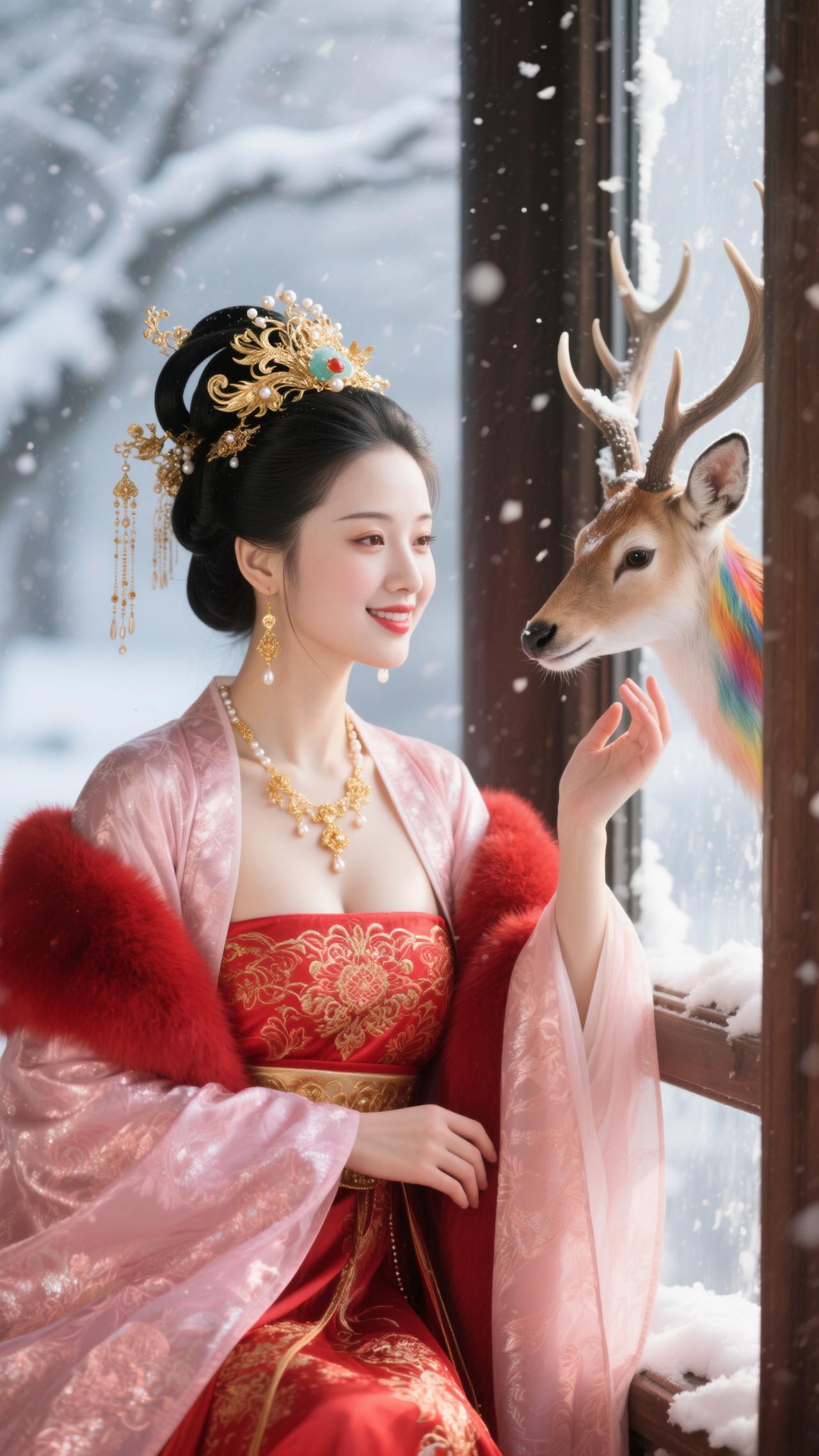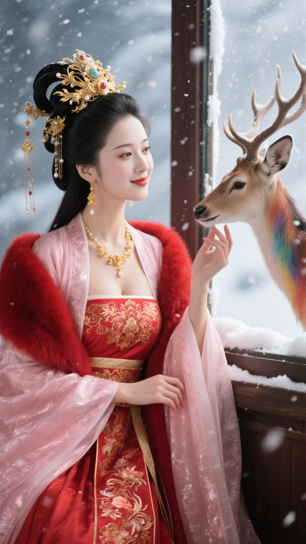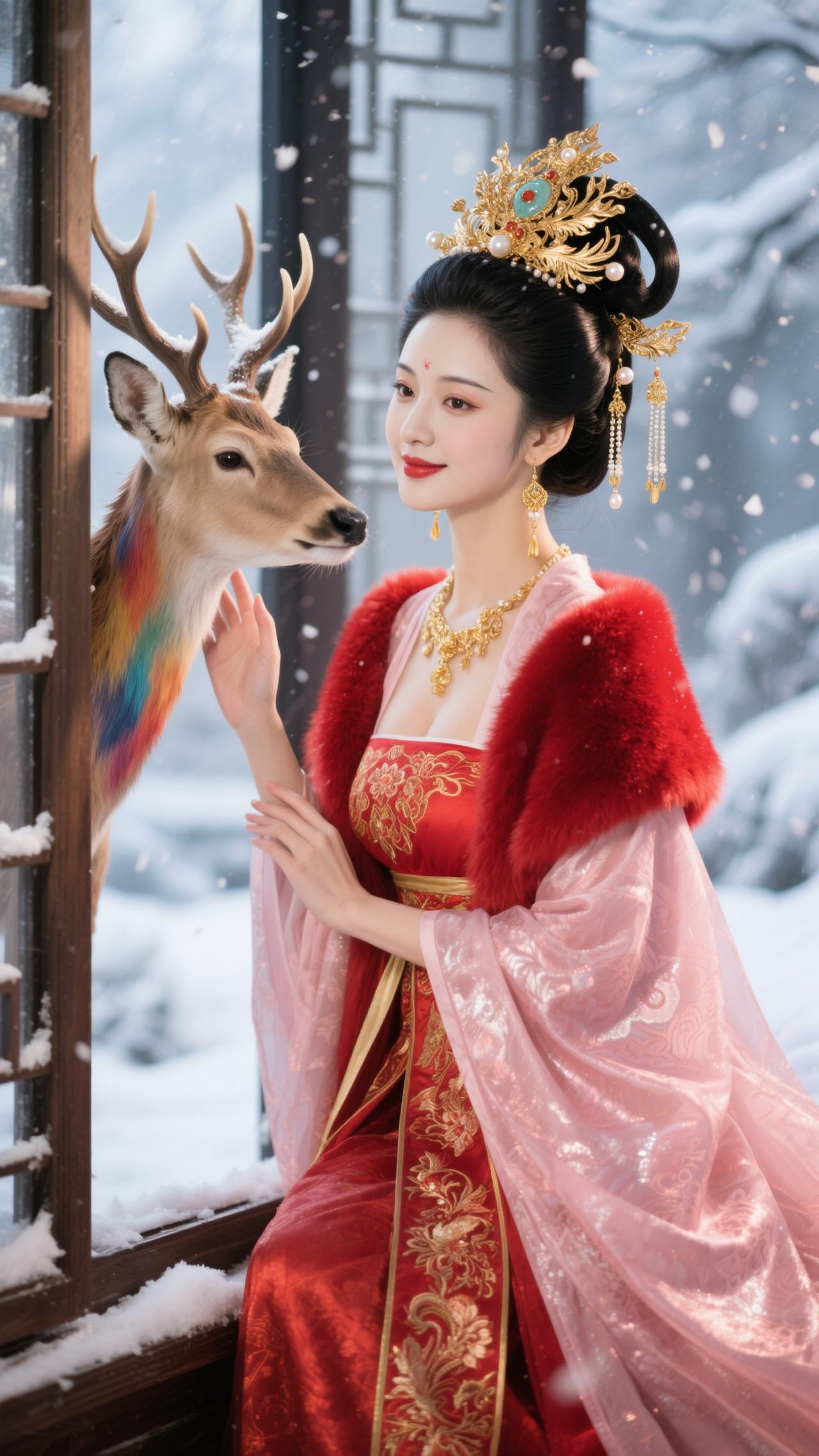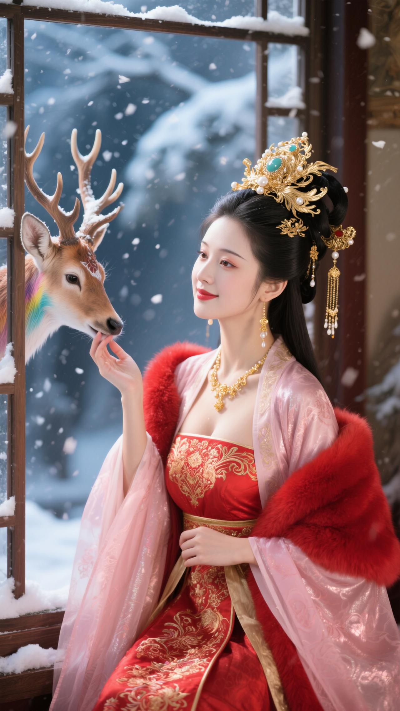 《蝶恋花·红妆雪鹿》 红袄金簪妆雪境,裘领堆霞,艳压枝头杏。 轻抚麋茸凝睇静