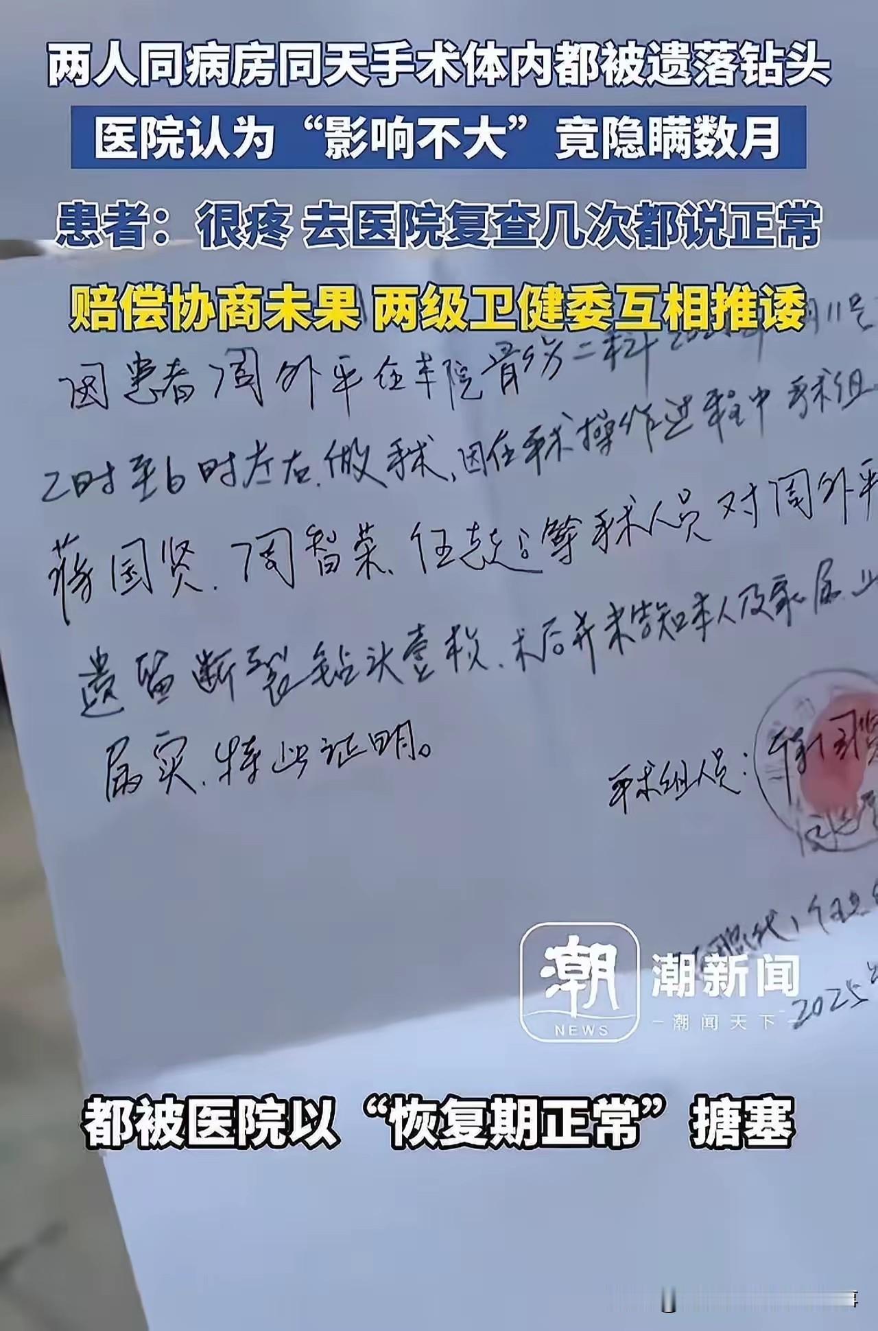 同室同日手术双双遗落钻头!湖南这家医院隐瞒数月,3万罚款引众怒 手术室里的医疗事故,成了患者半年的噩梦!湖南祁阳市中医医院的病房里,周外平与柏系生两位患者在2025年3月11日同一天接受骨科手术,术后却被持续的剧痛缠上。五个月里,他们反复复查追问,得到的始终是“体质差、恢复慢”的敷衍答复,直到转院检查才惊悉真相——体内竟都嵌着断裂的手术钻头。 更令人愤慨的是,医院早已知晓钻头遗落的事实,却以“影响不大”为由刻意隐瞒,甚至计划等后续取钢板时再“顺便处理”,将患者的血肉之躯当作临时“储物间”。直到患者拿出外院检查报告,院方才出具书面证明,承认“术后未告知本人及家属”的事实。 然而,这场严重违反医疗制度、漠视患者知情权的事故,最终仅换来3万元罚款和警告。对比“农民卖菜赚十几块被罚十几万”的案例,网友怒批“3万对医院如同九牛一毛”,如此轻飘飘的处罚根本无法形成震慑。要知道,体内遗留金属异物可能引发感染、器官损伤等风险,而医院同时存在未履行告知义务、病历填写不合规等多项违法情形,更暴露了手术器械清点制度的失守和监管漏洞。 医疗安全的底线不容践踏,患者的生命健康绝非“影响不大”的小事。目前双方已达成和解,但这起事件更该敲响行业警钟:唯有健全手术安全管控、强化违规问责力度、明确处罚梯度,才能守住医患信任的基石。 素材来源于网络,侵权删除。