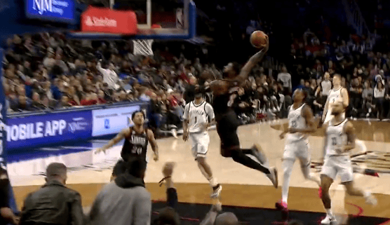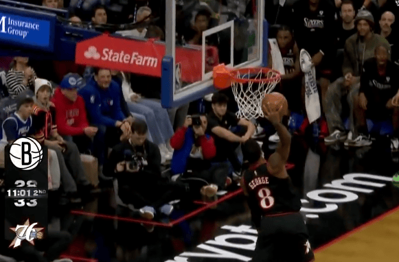 第二节比赛中,保罗-乔治抢断反击,罚球线一步起飞滑翔战斧劈扣。