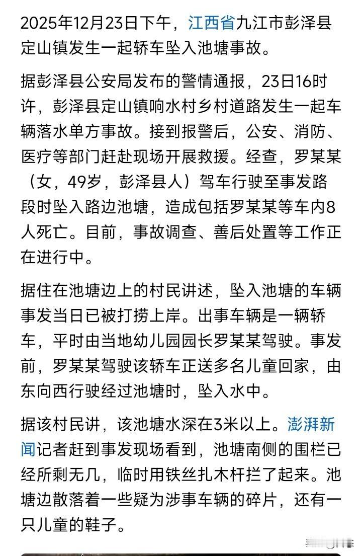 痛心,2025年12月23日16时许,江西彭泽县定山镇响水村发生一起车辆落水单方事故,导致包括司机罗某某(当地幼儿园园长)在内的8人全部遇难,车辆坠入3米深池塘后被打捞上岸。公安部门已启动事故调查与善后处置工作。 司机:罗某某,女,49岁,彭泽县人,当地幼儿园园长,事发时驾车送儿童回家。 车辆行驶中坠入路边池塘(水深超3米),接警后公安、消防、医疗等部门到场救援,车辆当日已打捞上岸。 12月24日彭泽县公安局通报,事故调查与善后处置正在进行中。 园长亲自送小孩,不知道什么原因掉入池塘,可惜了。 安全行驶,谁都不想出这样的事,如何避免才是关键!