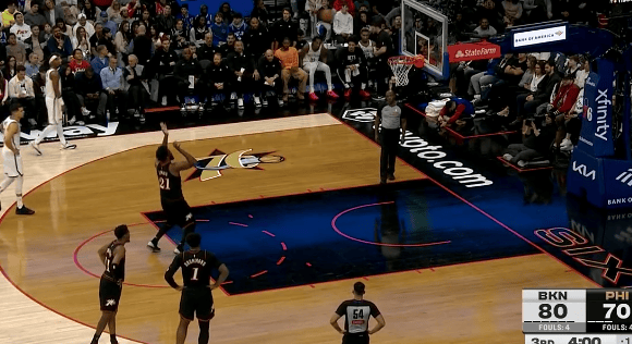 恩比德技术犯规罚球不进,76人下半场已经落后篮网13分