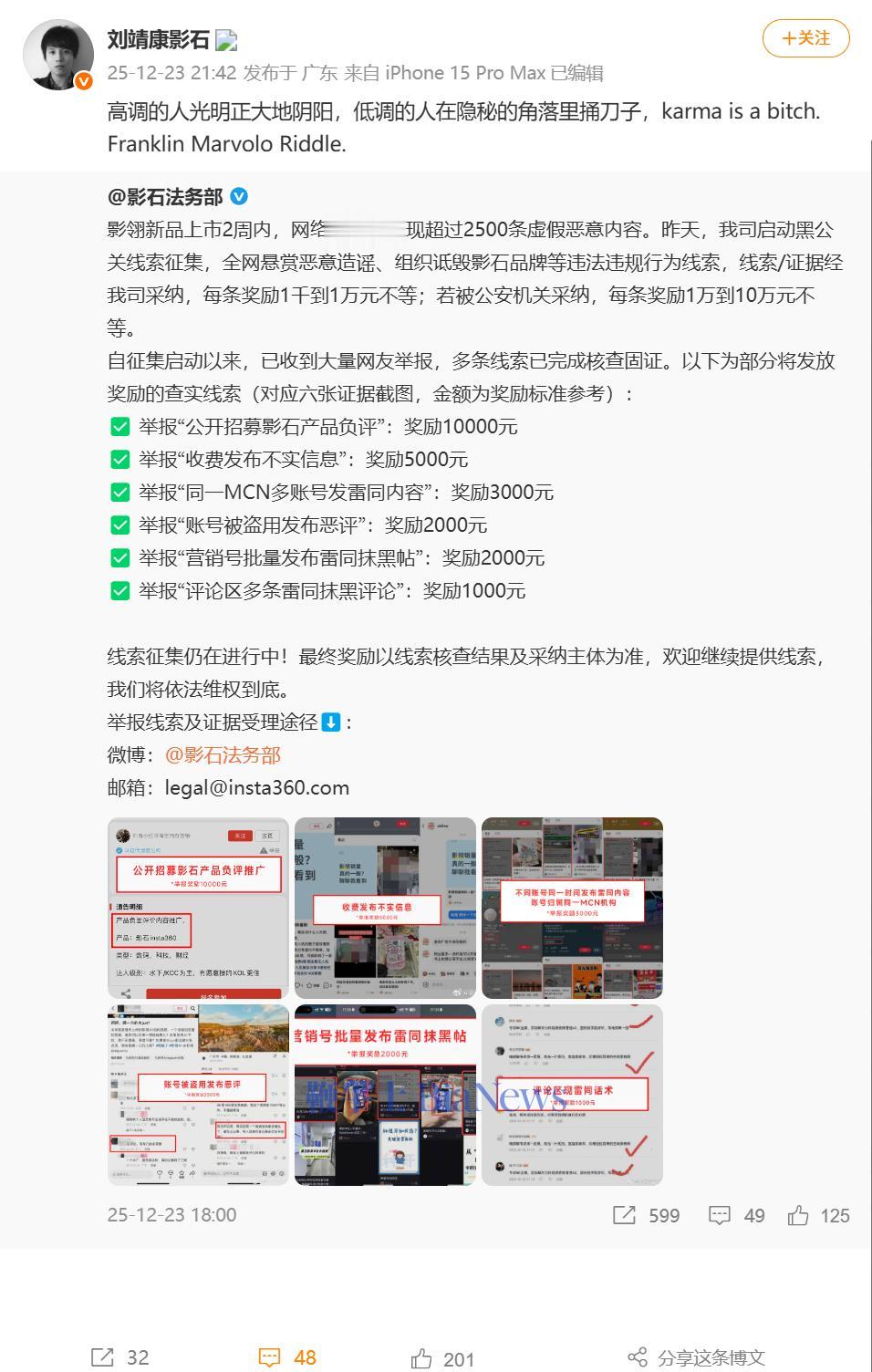 此前,影石法务部已作出回应,并表示全网悬赏恶意造谣、组织诋毁影石品牌等违法违规行为线索,线索/证据经我司采纳,每条奖励1千到1万元不等。