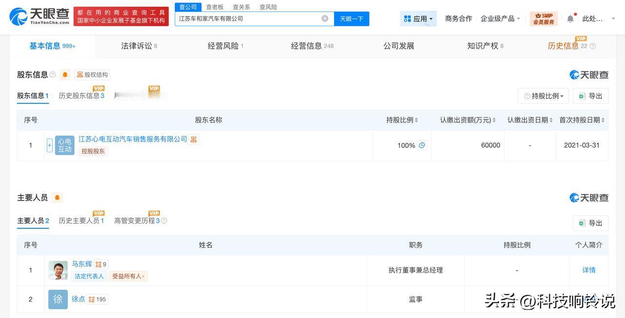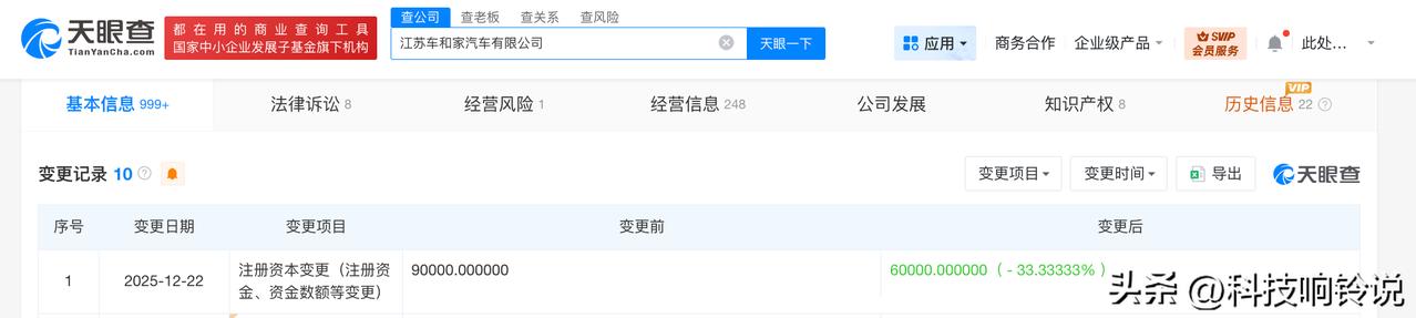 【理想汽车旗下江苏车和家公司减资至6亿 降幅约33%】 天眼查App显示,近日,江苏车和家汽车有限公司发生工商变更,注册资本由9亿人民币减至6亿人民币,降幅约33%。 该公司成立于2016年6月,法定代表人为马东辉,经营范围含新能源汽车、专用车、挂车、汽车车身的制造及销售,汽车、摩托车、电动车、场地车的零部件研发、制造、销售并提供售后服务等。股东信息显示,该公司由理想汽车旗下江苏心电互动汽车销售服务有限公司全资持股。 天眼查信息: