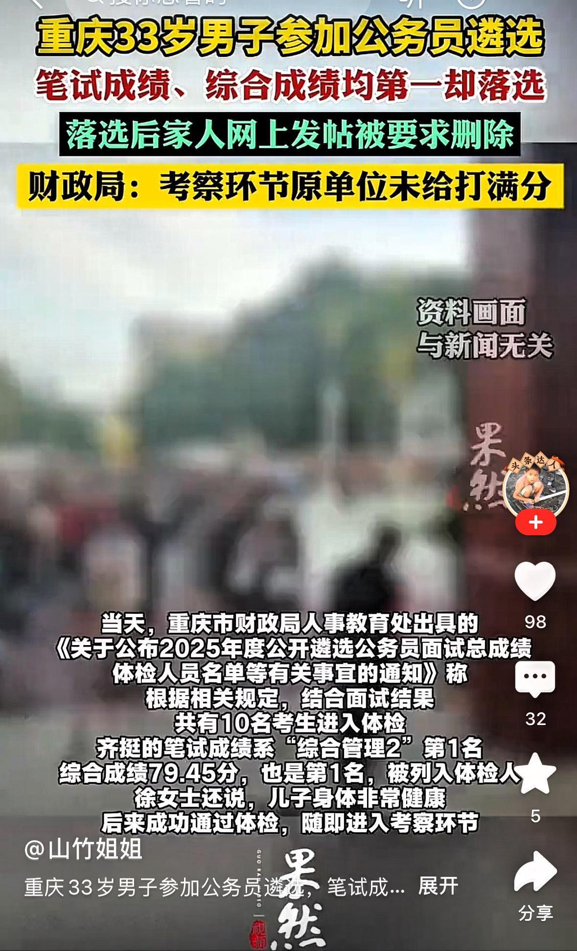 齐挺,化名,33岁,两江新区人,硕士,江津区参公单位副站长,报名重庆市财政局公开遴选,笔试第一,综合第一,最后没在名单里,家里人一头雾水,网友也问这是啥流程? 于重庆公职考圈,81.5分的笔试佳绩,搭配79.45分斩获综合第一,这般成绩,宛如一把有力钥匙,已将“体制内晋升”的大门推开了九成之多。年届三十有三的硕士齐挺,想来亦是这般思忖。为了这次从江津区参公单位往市财政局的跃迁,他挑灯夜战备考,熬过了资格审查,甚至在随后严苛的体检中也拿到通行证。然而,当那个只有5个人的拟试用名单在12月16日张榜公示时,所有人最不愿看到的一幕发生了:榜首落榜,榜眼和探花却赫然在列。 这并非系统bug,而是一场关于“分数为王”还是“综合评判”的残酷博弈。 要把这事掰扯清楚,得先撕开“公开遴选”和普通“公招”之间那层容易混淆的面纱。很多外行看热闹,觉得分数线就是生死线,但在行家眼里,这次遴选的游戏规则早就写在7月23日那份公告的折痕里——“差额考察”。 这四个字意味着,即便你是一骑绝尘的头名,招录单位也有权根据考察结果,伸手捞起排在你后面的第二名甚至第三名。这不是暗箱操作,这是写在纸面上的筛选权力。齐挺报考“综合管理2”岗,第二名仅落后他0.45分。如此细微分差,在“考察”这一严苛试炼中,仿若薄冰遇火,极易消融于无形。 但让齐家人乃至围观网友如鲠在喉的,不是规则本身,而是规则执行时的那股子“玄学”味道。 争议的引爆点定格在12月18日下午。彼时,公示已发布两日,市财政局工作人员专程前往齐挺的原单位,就相关事宜进行细致解释,以期消除疑虑、答疑解惑。这一解释,反而要把疑问越扯越大。官方给出的落选理由简直像是精准踩雷:一是原单位考察没给满分;二是缺个技术职称加分项;三是人岗不匹配。 这三条理由,咋一看挺硬,细琢磨全是软钉子。 先说这个“人岗不匹配”。回过头看7月底的报名环节,系统里的资格审查可不是摆设。齐挺硕士学历,两江新区人,有着基层历练,还得过单位肯定,当初无论是对着“经济类、土木类、工商管理”的宽泛专业要求,还是对着“预算改革、债务管理”的具体职能,那是绿灯放行的。既然过了初审,这都走到终点线了,突然又说这双脚不合这双鞋?这种“回马枪”式的否定,很难不让人联想到是先射箭再画靶子。 再看“没给满分”这一条,更是触碰了职场最隐秘的神经。据传,上岸的那几位,原单位评价全是满分,唯独齐挺没拿满。此分系何人所打?又是以何种方式打出?这般疑问,着实令人好奇不已。所谓的满分标准是什么?这成了一个巨大的黑箱。按照齐父的说法,儿子在原单位那是文艺骨干,主持、唱歌拿奖,人缘颇嘉。但在考察座谈那种封闭环境里,领导的一句“有所保留”,或者同事的一个“低分评价”,是否就能直接否决掉他在考卷上流下的汗水? 甚至这还引发了更诛心的猜测:是不是原单位惜才,不愿意放人,索性在考察环节“下了狠手”?又或者,如网络上那些看惯了沉浮的老手所言,遴选这池水深得很,只要入了考察圈,排在末尾的能逆袭,排第一的能被“做”掉,关键还得看“关系”够不够硬?虽然这只是推测,但在不透明的评价体系面前,阴谋论总是跑得比真相快。 至于“缺职称”这条,更是让家属觉得冤。齐挺身为副站长,走的是行政管理路径,与那些整日与图纸数据为伴的专业技术岗位人员不同,他更多地投身于行政事务的统筹与管理。拿技术职称卡一个行政编的脖子,这逻辑是不是有些错位? 面对家属的满腹委屈和发帖求助,换来的却是删帖的警告。记者试图去人事教育处讨个说法,得到的也只是“负责人外出”“不清楚情况”的标准外交辞令。那一长串的选拔链条——从深夜复习到81.5分的高光时刻,从10月9日查分的欣喜到12月公示名单的冰冷,中间卡着的,究竟是公平的量尺,还是人为的操作空间? 这一场落榜,不仅困住了那个等着说法的齐挺,也让更多埋头苦读的人心头一紧。众人并非畏惧失败,毕竟输赢乃常事。真正令人惶恐的,是在挫折面前,如置身迷雾,全然不知失利根源何在,恰似无头苍蝇般茫然无措。 如果是考察标准有细则,比如必须有中级职称,必须原单位满意度100%,那为何不早早公开量表,非要等到尘埃落定再来这一出“解释”?分数的权重若是在最后环节能被几句谈话评价轻易稀释,那前面的笔试面试第一,岂不成了最大的笑话?现在,除了那几张冰冷的公示截图和无处安放的问号,一切还在等待一个更体面、更透明的答案。