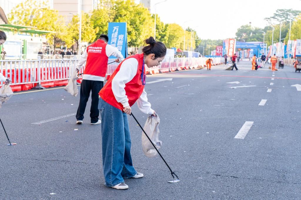 同时,身穿红色马甲的“万绿缘”志愿者手拿钳子、垃圾袋与扫帚,俯身夹起路面的空纸杯、包装纸、纸巾等垃圾,并进行分类投放,用实际行动示范垃圾分类、维护赛场环境。