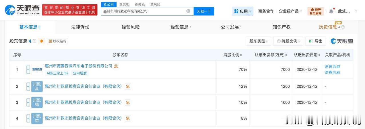 【德赛西威等成立川行致远科技公司 注册资本1亿】 天眼查App显示,近日,惠州市川行致远科技有限公司成立,法定代表人为陈俊峰,注册资本1亿人民币,经营范围含人工智能应用软件开发、人工智能理论与算法软件开发、人工智能硬件销售、人工智能行业应用系统集成服务、物联网技术服务、物联网设备制造、工业机器人制造、工业机器人销售、智能机器人的研发、新能源汽车整车销售等,由德赛西威(002920)、惠州市川致昌投资咨询合伙企业(有限合伙)、惠州市川致德投资咨询合伙企业(有限合伙)、惠州市川致杰投资咨询合伙企业(有限合伙)共同持股。 天眼查信息: