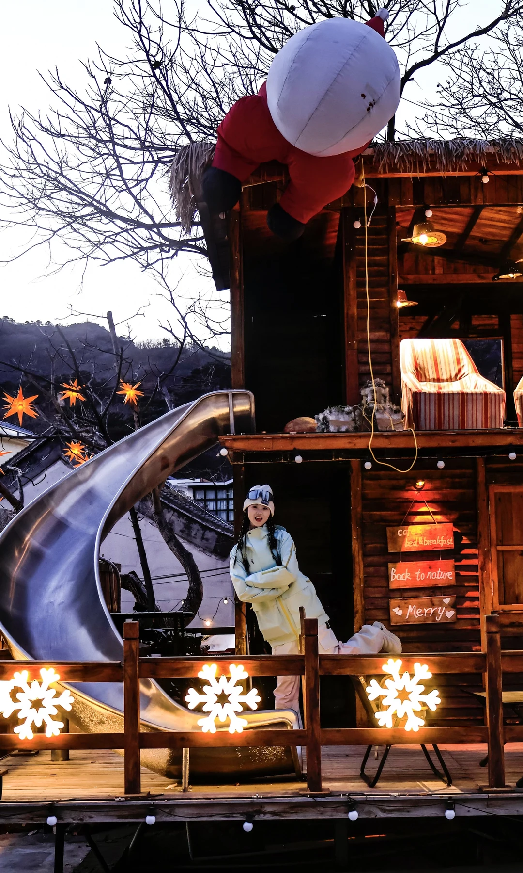 板栗村童话小屋:夜晚暖灯亮起,圣诞袜与星星灯饰搭配,还有雪花飘落,宛如圣诞电影场景