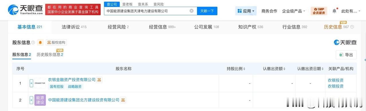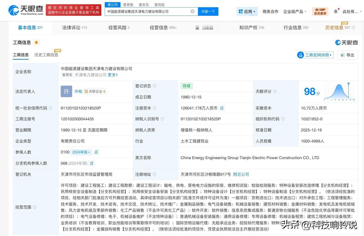 【中国能建旗下天津电力建设公司增资至12.6亿 增幅约17.5%】 天眼查App显示,近日,中国能源建设集团天津电力建设有限公司发生工商变更,注册资本由约10.7亿人民币增至约12.6亿人民币,增幅约17.5%,同时,多位高管也发生变更。 该公司成立于1980年12月,法定代表人为许栋,经营范围含建设工程施工、建设工程勘察、建设工程设计、检验检测服务、货物进出口、技术进出口、对外承包工程、工程管理服务等,由农银金融资产投资有限公司、中国能源建设集团北方建设投资有限公司共同持股。 天眼查信息: