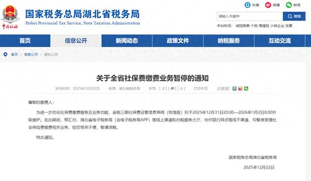 近日,国家税务总局湖北省税务局发布通知,为进一步优化社保费缴费服务及业务功能,金税三期社保费征管信息系统(标准版)拟于2025年12月31日20:00—2026年1月2日8:00升级维护。在此期间,鄂汇办、湖北省电子税务局(含电子税务局APP)等线上渠道和办税服务厅、协作银行网点等线下渠道,均暂停受理社会保险费缴费相关业务。