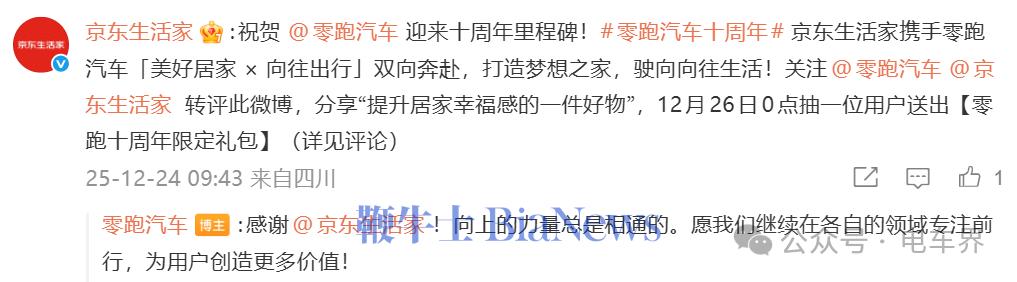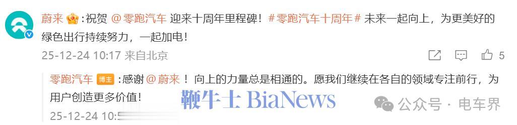 蔚来:祝贺零跑汽车迎来十周年里程碑!零跑汽车十周年未来一起向上,为更美好的绿色出行持续努力,一起加电!