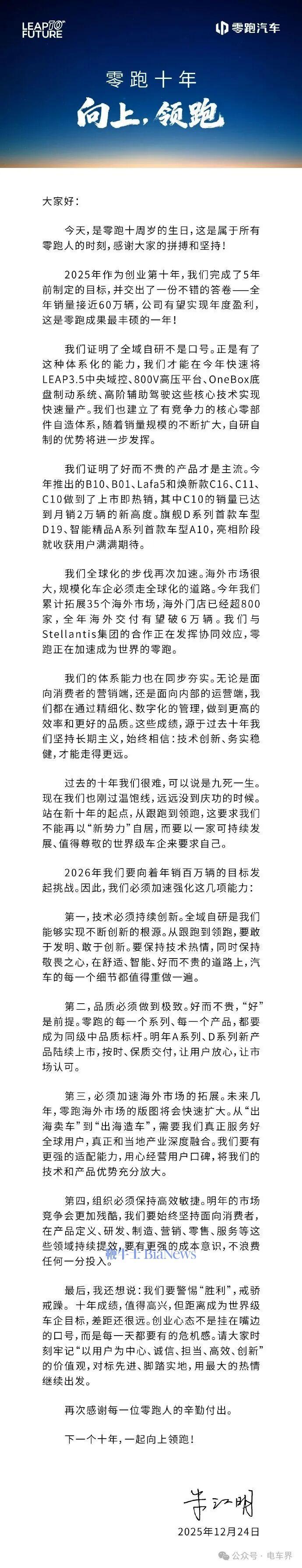 零跑汽车今日迎来创立十周年,零跑汽车创始人、董事长、CEO朱江明发布十周年全员信。