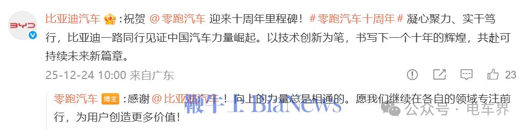比亚迪:祝贺零跑汽车迎来十周年里程碑!零跑汽车十周年凝心聚力、实干笃行,比亚迪一路同行见证中国汽车力量崛起。以技术创新为笔,书写下一个十年的辉煌,共赴可持续未来新篇章。