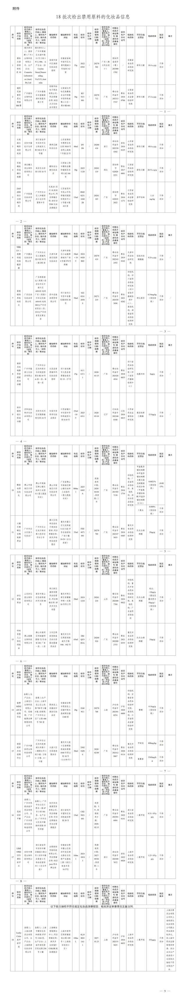 18批次检出禁用原料的化妆品信息
