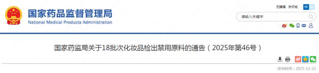 关于18批次化妆品检出禁用原料的通告
