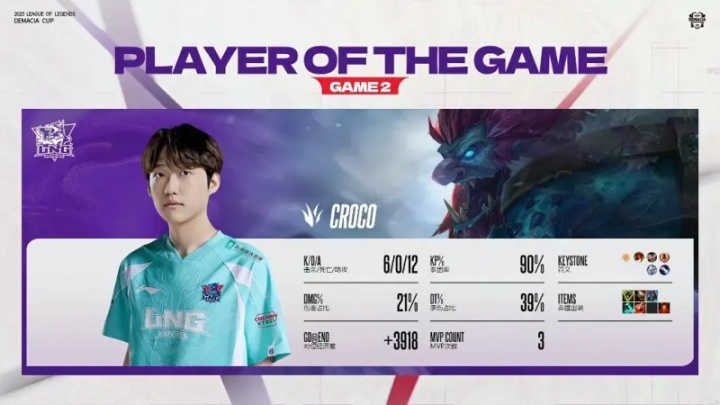 直播吧12月24日讯今日德杯比赛上,LNG第二局击败OMG将比分扳平,赛后Croco巨魔打出6/0/12战绩,斩获次局MVP。