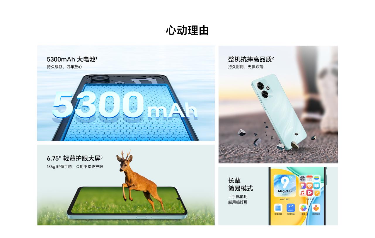 荣耀 Play10A 上架荣耀商城,型号 NLA-AN00,4+128GB 售价 799 元、6+128GB 售价 899 元。看看 2025 年底的百元机是什么水平了? - 芯片:联发科天玑 6300 处理器; - 屏幕:6.75 英寸 1600×720 LCD 屏幕,支持 90Hz 刷新率,类自然光护眼; - 相机:前置 5MP,后置 13MP 单摄; - 续航:5300mAh 电池,支持 15W 快充,126 分钟充电 100%; - 其他:厚 7.89mm,重 186g,墨岩黑、海湖青、碧空蓝 3 款配色,支持 Wi-Fi 5、蓝牙 5.3,USB 2.0 接口,保留 3.5mm 耳机孔,单扬声器、单麦克风,支持大音量模式,无指纹识别,搭载基于Android 15 的 MagicOS 9.0 系统。