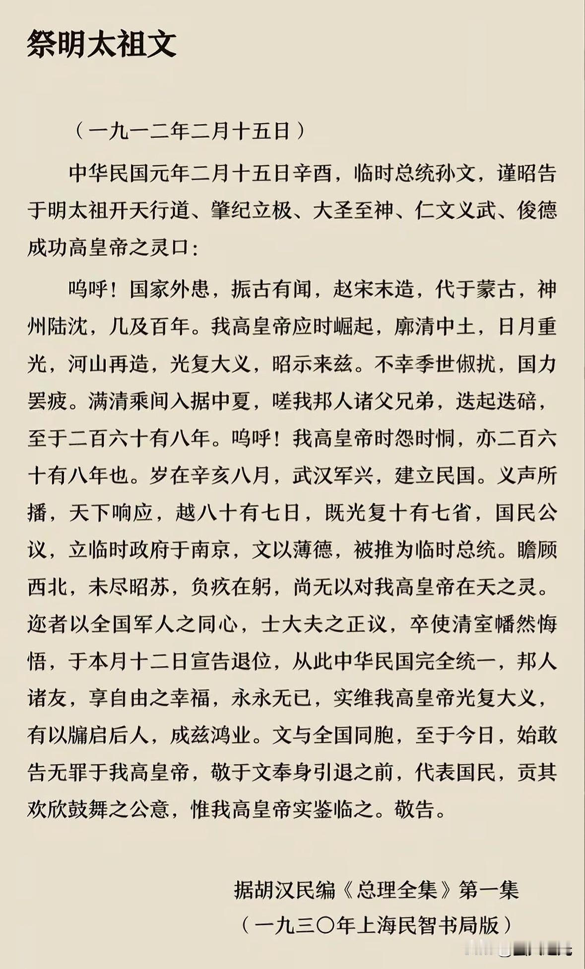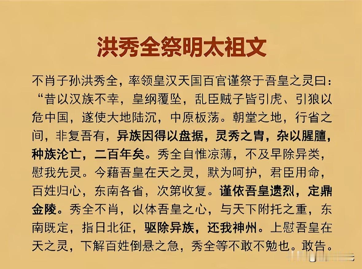 明太祖朱元璋开国宣言,喊出“驱胡虏、复中华、立纲纪、救万民”,以民族大义和儒家纲常为旗,推翻元朝合法,宣示明朝治国方略,兼具动员、号召与正统确立之效,面向中原百姓与反元势力。 洪秀全祭明太祖文,和孙中山昭告明太祖文,都以“驱逐异族、恢复中华”为核心旗帜,将自身行动作为为对汉族正统政权的恢复。朱元璋 你认为“驱逐鞑虏,恢复中华”过时了吗 为什么清朝不被人们所喜欢呢?
